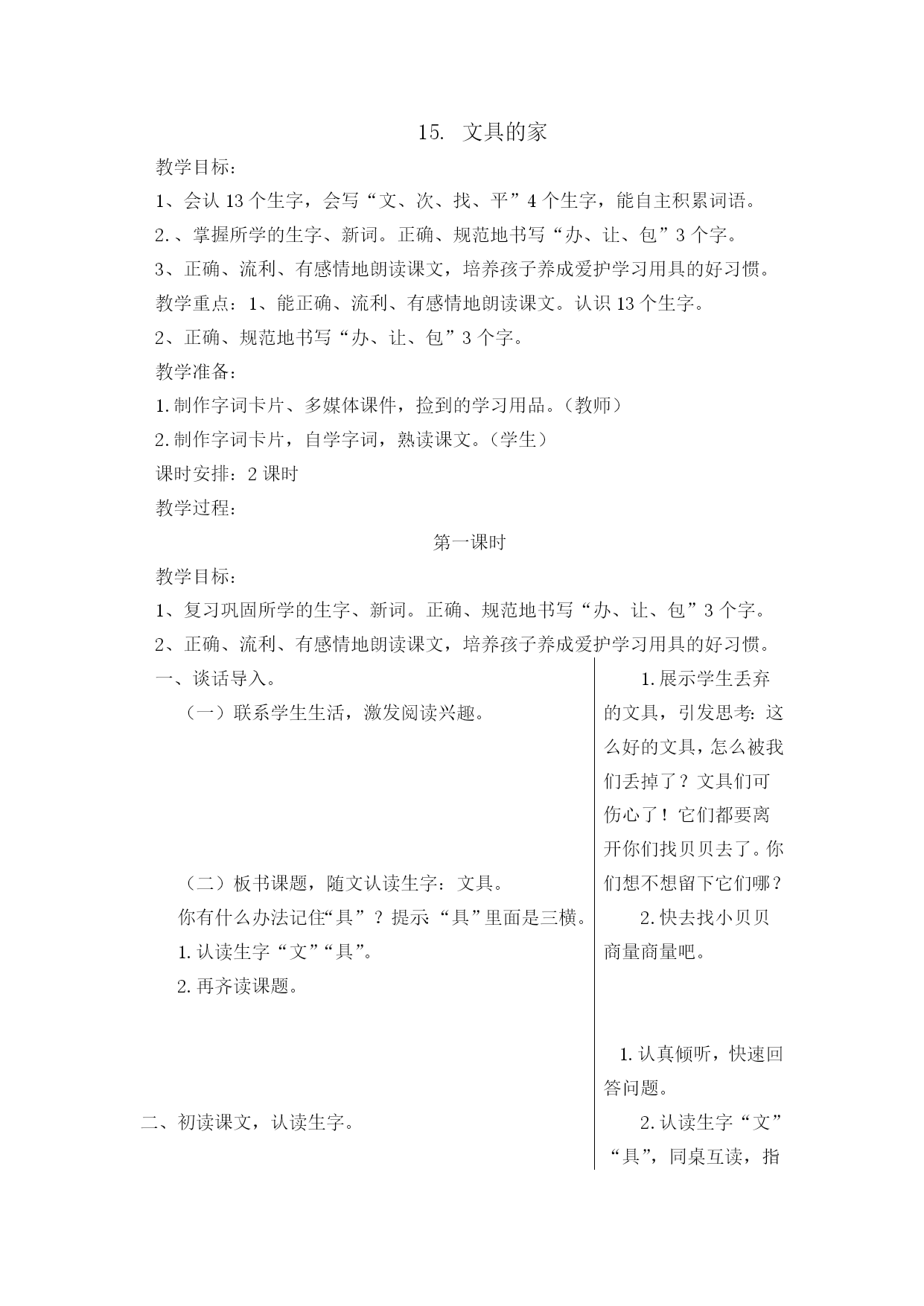 15.文具的家教学目标:1、会认13个生字,会写“文、次、找、平”4个生字,能自主积累词语。2.、掌握所学的生字、新词。正确、规范地书写“办、让、包”3个字。3、正确、流利、有感情地朗读课文,培养孩子养成爱护学习用具的好习惯。教学重点:1、能正确、流利、有感情地朗读课文。认识13个生字。2、正确、规范地书写“办、让、包”3个字。教学准备:1.制作字词卡片、多媒体课件,捡到的学习用品。(教师)2.制作字词卡片,自学字词,熟读课文。(学生)课时安排:2课时教学过程:第一课时教学目标:1、复习巩固所学的生字、新