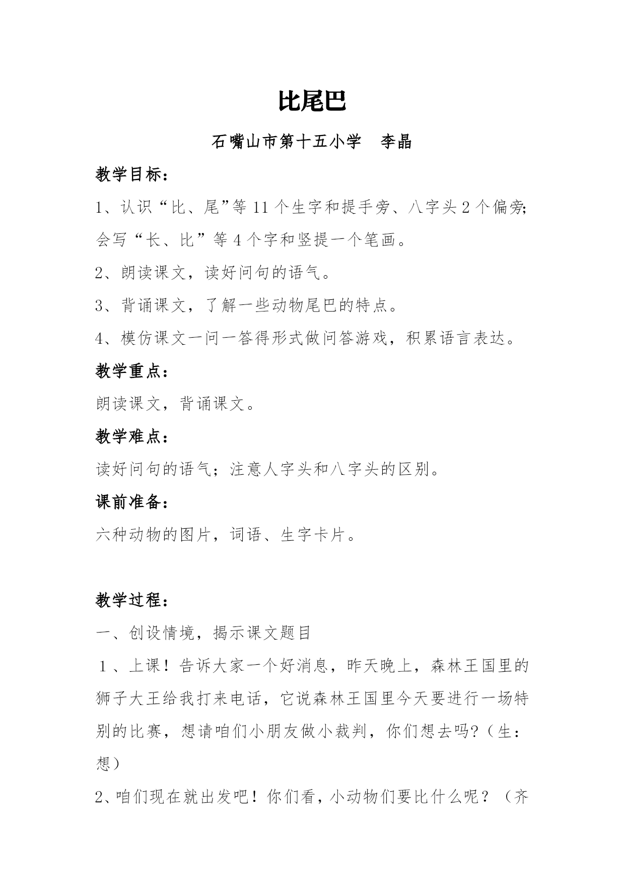 比尾巴石嘴山市第十五小学李晶教学目标:认识“比、尾”等11个生字和提手旁、八字头2个偏旁;会写“长、比”等4个字和竖提一个笔画。朗读课文,读好问句的语气。背诵课文,了解一些动物尾巴的特点。4、模仿课文一问一答得形式做问答游戏,积累语言表达。教学重点:朗读课文,背诵课文。教学难点:读好问句的语气;注意人字头和八字头的区别。课前准备:六种动物的图片,词语、生字卡片。HYPERLINK"http://www.zengmin.net/"\t"http://blog.sina.com.cn/s/_blank"教