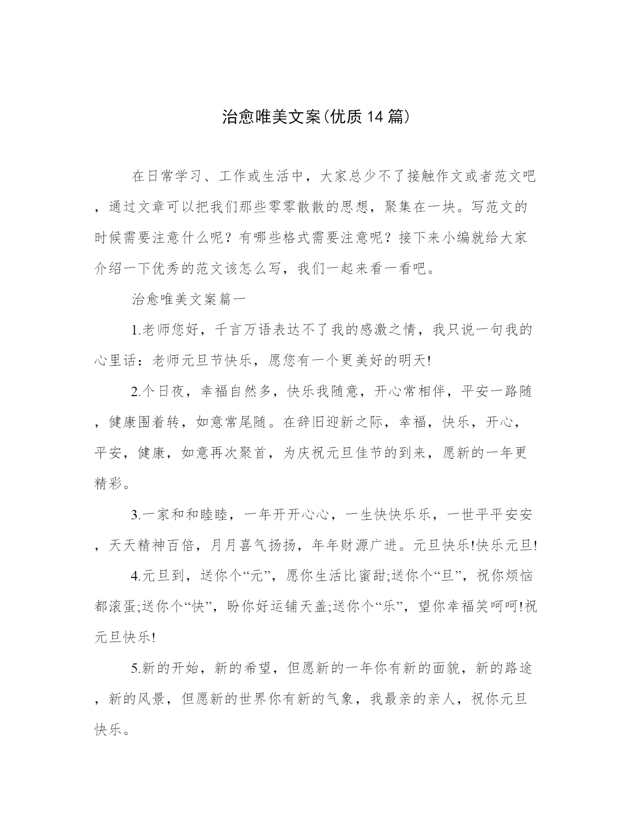 治愈唯美文案(优质14篇)在日常学习、工作或生活中,大家总少不了接触作文或者范文吧,通过文章可以把我们那些零零散散的思想,聚集在一块。写范文的时候需要注意什么呢?有哪些格式需要注意呢?接下来小编就给大家介绍一下优秀的范文该怎么写,我们一起来看一看吧。治愈唯美文案篇一1.老师您好,千言万语表达不了我的感激之情,我只说一句我的心里话:老师元旦节快乐,愿您有一个更美好的明天!2.个日夜,幸福自然多,快乐我随意,开心常相伴,平安一路随,健康围着转,如意常尾随。在辞旧迎新之际,幸福,快乐,开心,平安,健康,如意再次