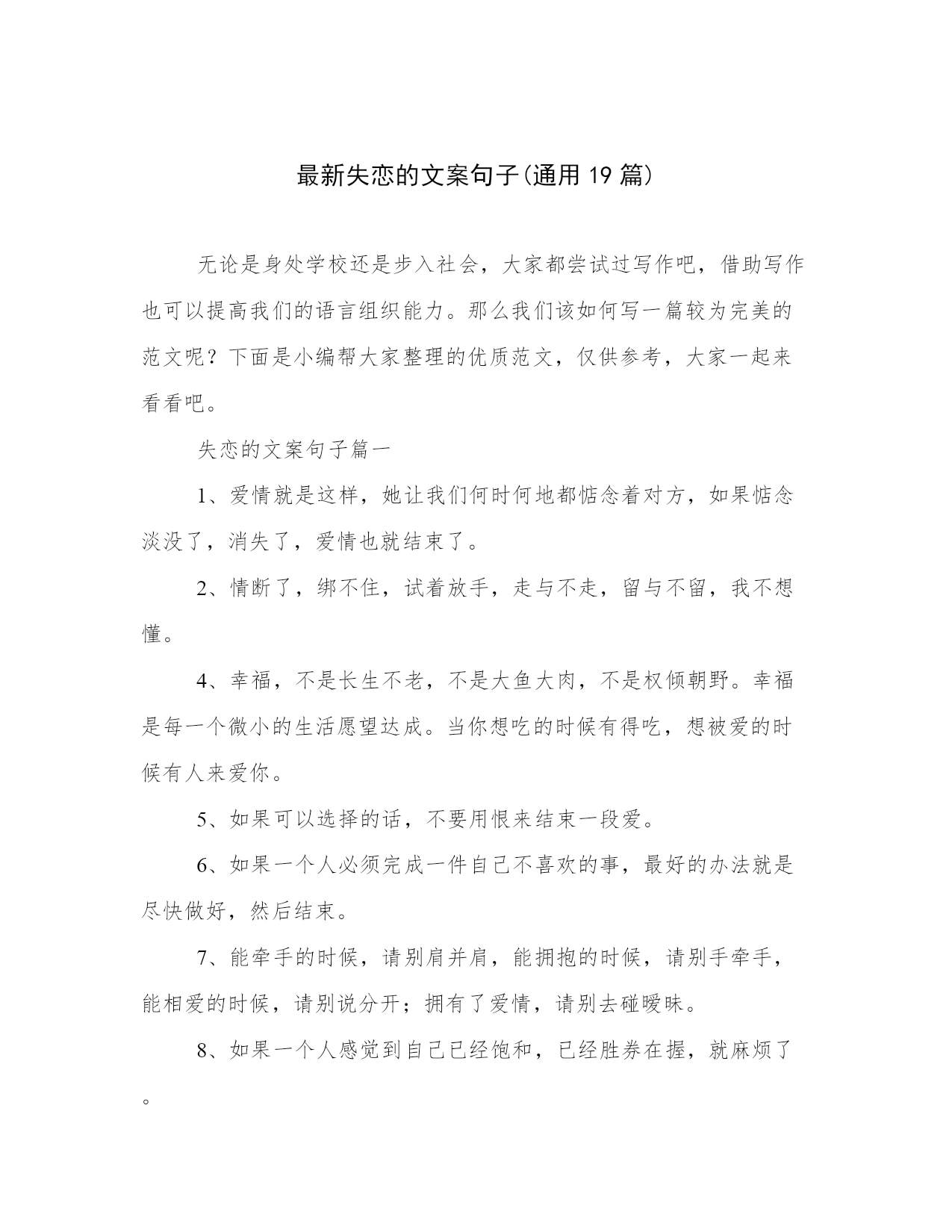 最新失恋的文案句子(通用19篇)无论是身处学校还是步入社会,大家都尝试过写作吧,借助写作也可以提高我们的语言组织能力。那么我们该如何写一篇较为完美的范文呢?下面是小编帮大家整理的优质范文,仅供参考,大家一起来看看吧。失恋的文案句子篇一1、爱情就是这样,她让我们何时何地都惦念着对方,如果惦念淡没了,消失了,爱情也就结束了。2、情断了,绑不住,试着放手,走与不走,留与不留,我不想懂。4、幸福,不是长生不老,不是大鱼大肉,不是权倾朝野。幸福是每一个微小的生活愿望达成。当你想吃的时候有得吃,想被爱的时候有人来爱你