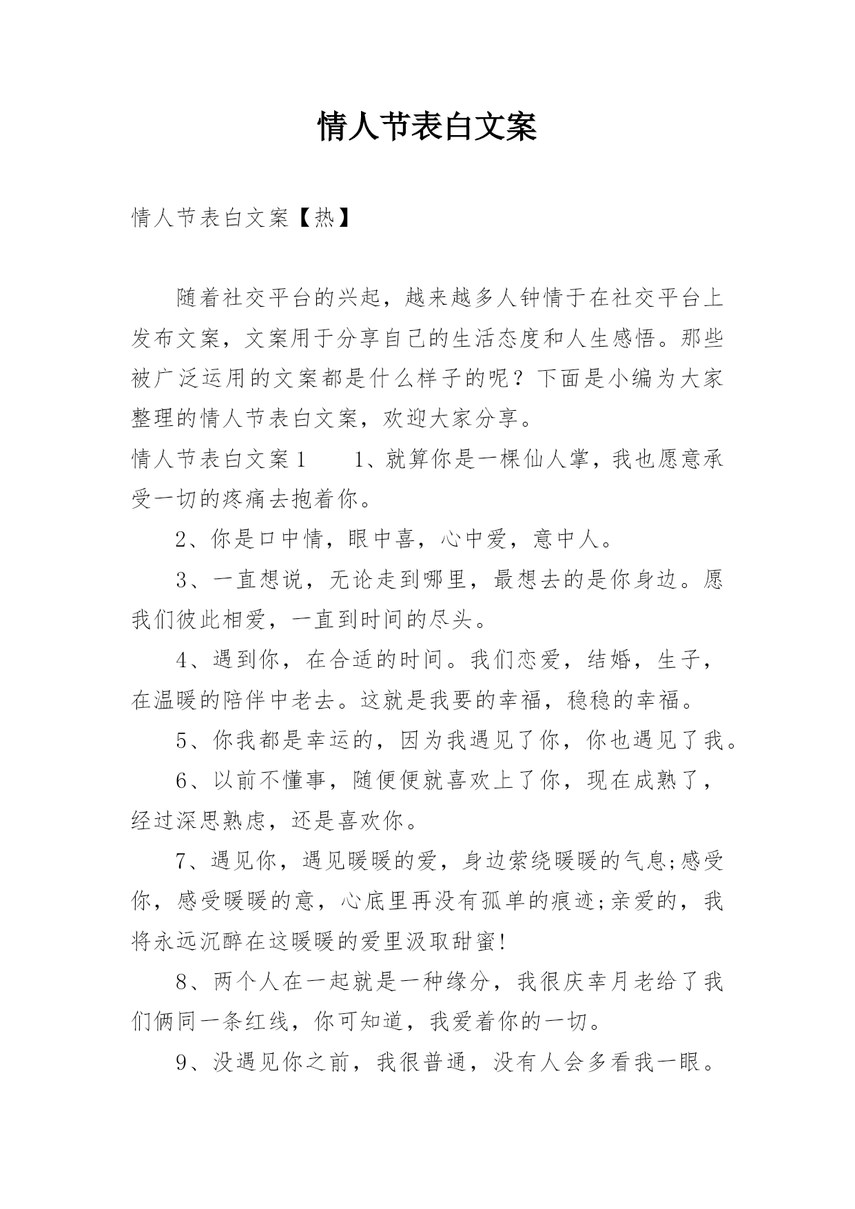 情人节表白文案情人节表白文案【热】随着社交平台的兴起,越来越多人钟情于在社交平台上发布文案,文案用于分享自己的生活态度和人生感悟。那些被广泛运用的文案都是什么样子的呢?下面是小编为大家整理的情人节表白文案,欢迎大家分享。情人节表白文案11、就算你是一棵仙人掌,我也愿意承受一切的疼痛去抱着你。2、你是口中情,眼中喜,心中爱,意中人。3、一直想说,无论走到哪里,最想去的是你身边。愿我们彼此相爱,一直到时间的尽头。4、遇到你,在合适的时间。我们恋爱,结婚,生子,在温暖的陪伴中老去。这就是我要的幸福,稳稳的幸福。
