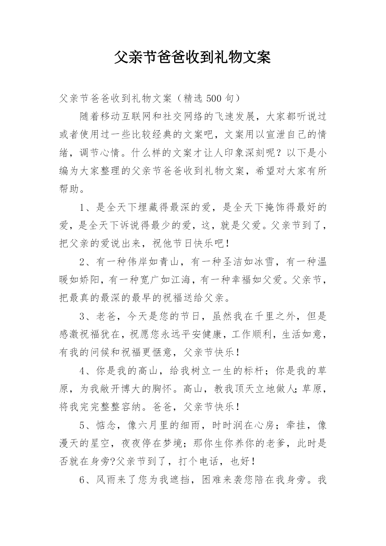 父亲节爸爸收到礼物文案父亲节爸爸收到礼物文案(精选500句)随着移动互联网和社交网络的飞速发展,大家都听说过或者使用过一些比较经典的文案吧,文案用以宣泄自己的情绪,调节心情。什么样的文案才让人印象深刻呢?以下是小编为大家整理的父亲节爸爸收到礼物文案,希望对大家有所帮助。1、是全天下埋藏得最深的爱,是全天下掩饰得最好的爱,是全天下诉说得最少的爱,这,就是父爱。父亲节到了,把父亲的爱说出来,祝他节日快乐吧!2、有一种伟岸如青山,有一种圣洁如冰雪,有一种温暖如娇阳,有一种宽广如江海,有一种幸福如父爱。父亲节,把