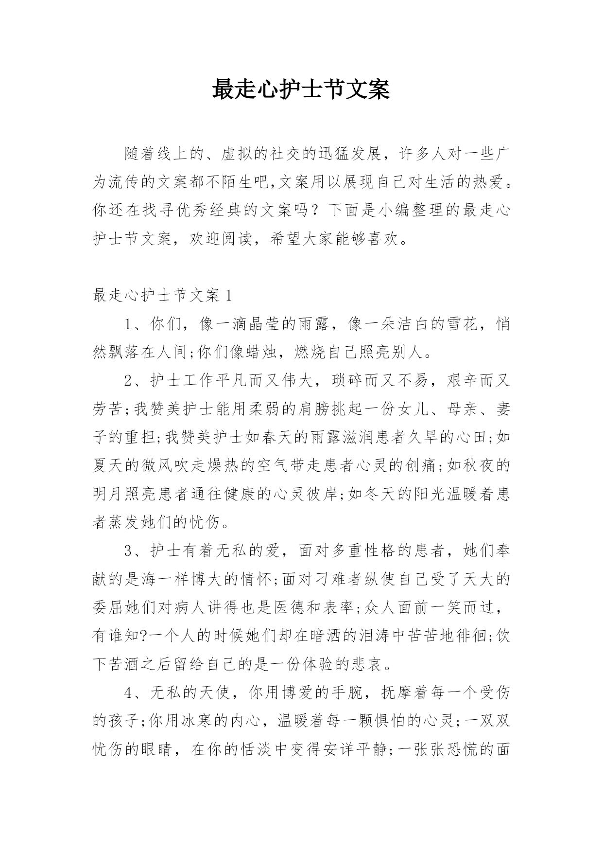 最走心护士节文案随着线上的、虚拟的社交的迅猛发展,许多人对一些广为流传的文案都不陌生吧,文案用以展现自己对生活的热爱。你还在找寻优秀经典的文案吗?下面是小编整理的最走心护士节文案,欢迎阅读,希望大家能够喜欢。最走心护士节文案11、你们,像一滴晶莹的雨露,像一朵洁白的雪花,悄然飘落在人间;你们像蜡烛,燃烧自己照亮别人。2、护士工作平凡而又伟大,琐碎而又不易,艰辛而又劳苦;我赞美护士能用柔弱的肩膀挑起一份女儿、母亲、妻子的重担;我赞美护士如春天的雨露滋润患者久旱的心田;如夏天的微风吹走燥热的空气带走患者心灵的