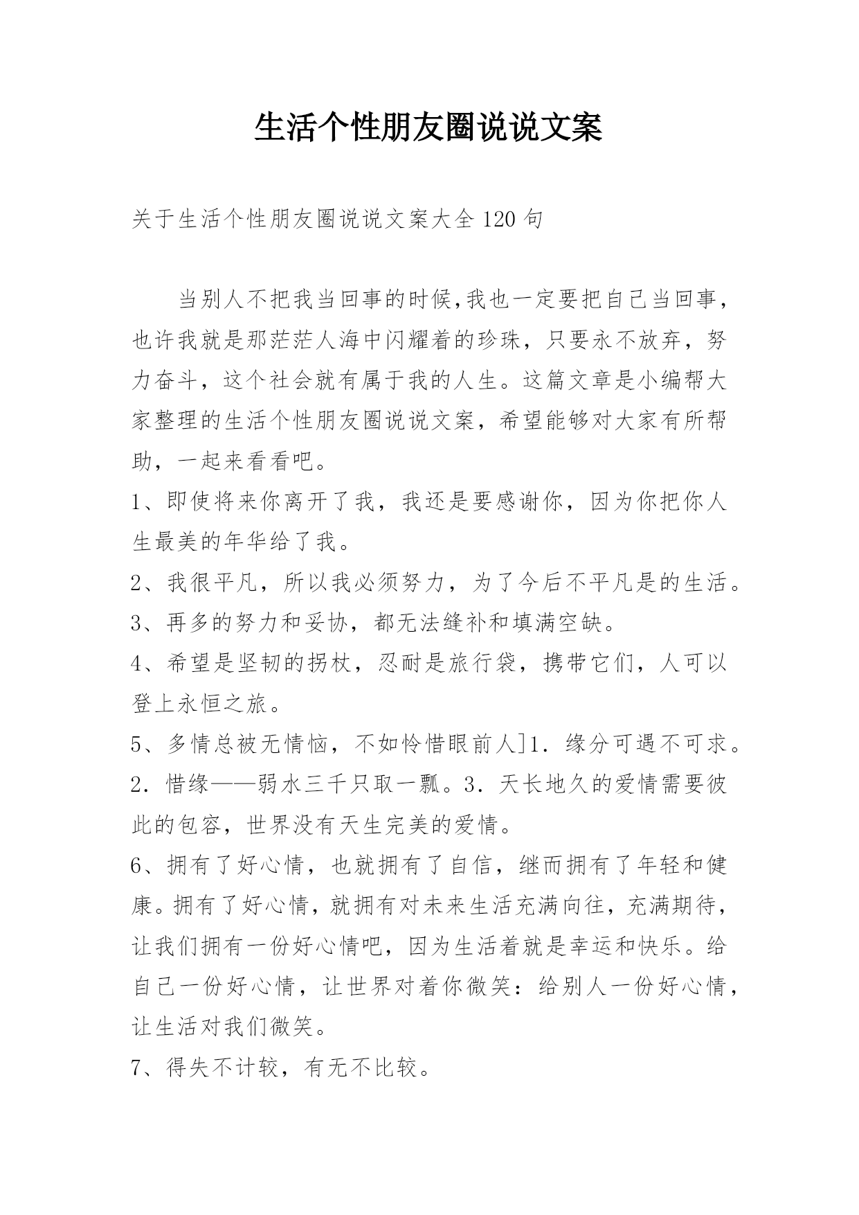 生活个性朋友圈说说文案关于生活个性朋友圈说说文案大全120句当别人不把我当回事的时候,我也一定要把自己当回事,也许我就是那茫茫人海中闪耀着的珍珠,只要永不放弃,努力奋斗,这个社会就有属于我的人生。这篇文章是小编帮大家整理的生活个性朋友圈说说文案,希望能够对大家有所帮助,一起来看看吧。1、即使将来你离开了我,我还是要感谢你,因为你把你人生最美的年华给了我。2、我很平凡,所以我必须努力,为了今后不平凡是的生活。3、再多的努力和妥协,都无法缝补和填满空缺。4、希望是坚韧的拐杖,忍耐是旅行袋,携带它们,人可以登上
