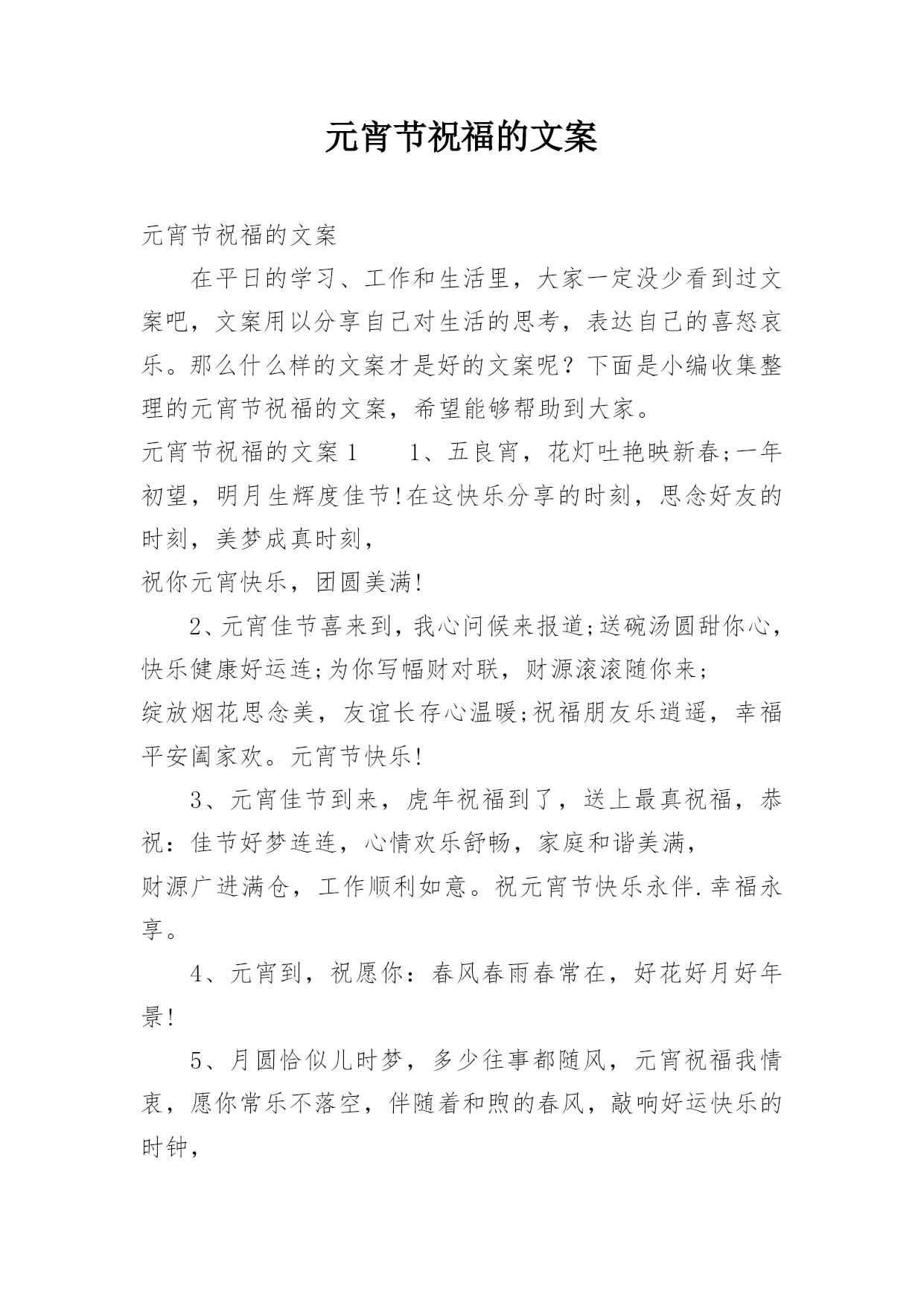 元宵节祝福的文案元宵节祝福的文案在平日的学习、工作和生活里,大家一定没少看到过文案吧,文案用以分享自己对生活的思考,表达自己的喜怒哀乐。那么什么样的文案才是好的文案呢?下面是小编收集整理的元宵节祝福的文案,希望能够帮助到大家。元宵节祝福的文案11、五良宵,花灯吐艳映新春;一年初望,明月生辉度佳节!在这快乐分享的时刻,思念好友的时刻,美梦成真时刻,祝你元宵快乐,团圆美满!2、元宵佳节喜来到,我心问候来报道;送碗汤圆甜你心,快乐健康好运连;为你写幅财对联,财源滚滚随你来;绽放烟花思念美,友谊长存心温暖;祝福朋