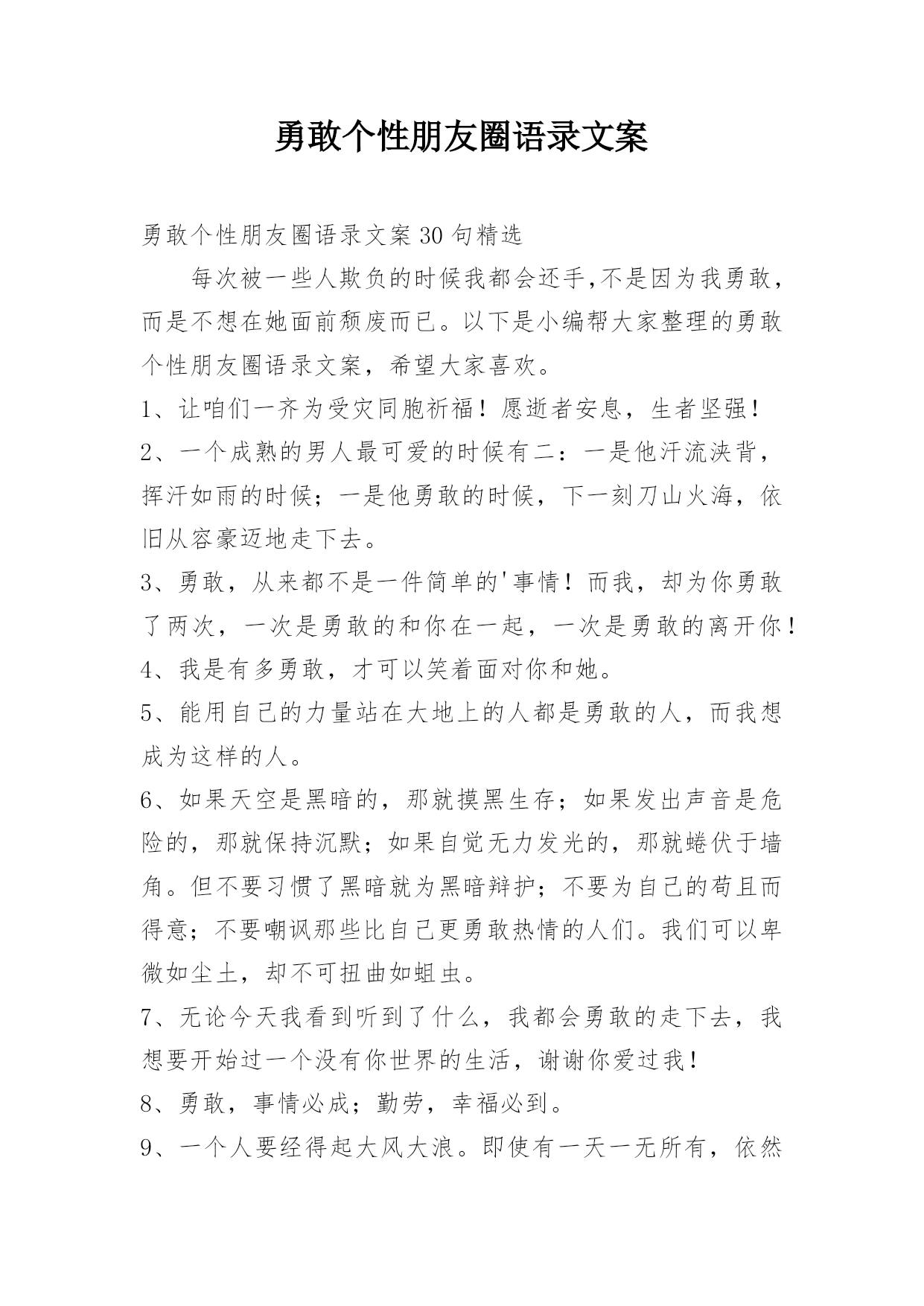 勇敢个性朋友圈语录文案勇敢个性朋友圈语录文案30句精选每次被一些人欺负的时候我都会还手,不是因为我勇敢,而是不想在她面前颓废而已。以下是小编帮大家整理的勇敢个性朋友圈语录文案,希望大家喜欢。1、让咱们一齐为受灾同胞祈福!愿逝者安息,生者坚强!2、一个成熟的男人最可爱的时候有二:一是他汗流浃背,挥汗如雨的时候;一是他勇敢的时候,下一刻刀山火海,依旧从容豪迈地走下去。3、勇敢,从来都不是一件简单的'事情!而我,却为你勇敢了两次,一次是勇敢的和你在一起,一次是勇敢的离开你!4、我是有多勇敢,才可以笑着面对你和她