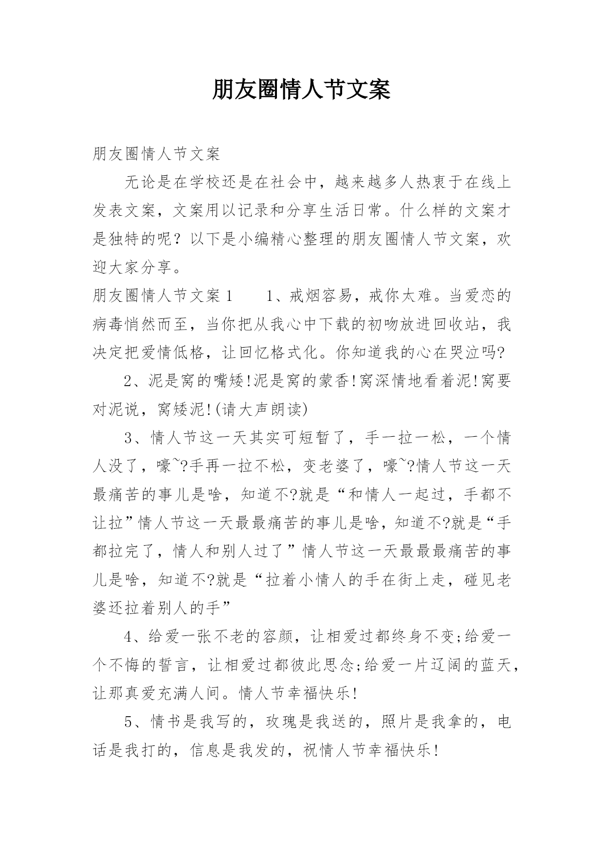 朋友圈情人节文案朋友圈情人节文案无论是在学校还是在社会中,越来越多人热衷于在线上发表文案,文案用以记录和分享生活日常。什么样的文案才是独特的呢?以下是小编精心整理的朋友圈情人节文案,欢迎大家分享。朋友圈情人节文案11、戒烟容易,戒你太难。当爱恋的病毒悄然而至,当你把从我心中下载的初吻放进回收站,我决定把爱情低格,让回忆格式化。你知道我的心在哭泣吗?2、泥是窝的嘴矮!泥是窝的蒙香!窝深情地看着泥!窝要对泥说,窝矮泥!(请大声朗读)3、情人节这一天其实可短暂了,手一拉一松,一个情人没了,嚎~?手再一拉不松,变