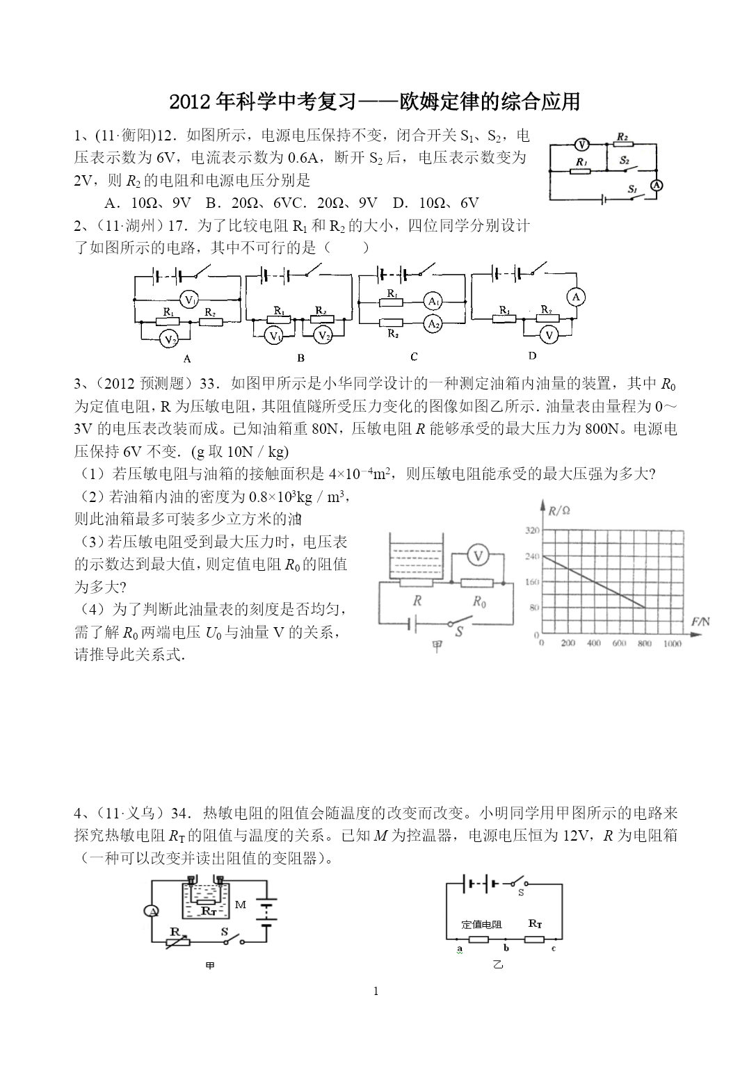 PAGEPAGE72012年科学中考复习——欧姆定律的综合应用1、(11·衡阳)12.如图所示,电源电压保持不变,闭合开关S1、S2,电压表示数为6V,电流表示数为0.6A,断开S2后,电压表示数变为2V,则R2的电阻和电源电压分别是A.10Ω、9VB.20Ω、6VC.20Ω、9VD.10Ω、6V2、(11·湖州)17.为了比较电阻R1和R2的大小,四位同学分别设计了如图所示的电路,其中不可行的是()3、(2012预测题)33.如图甲所示是小华同学设计的一种测定油箱内油量的装置,其中R0为定值
