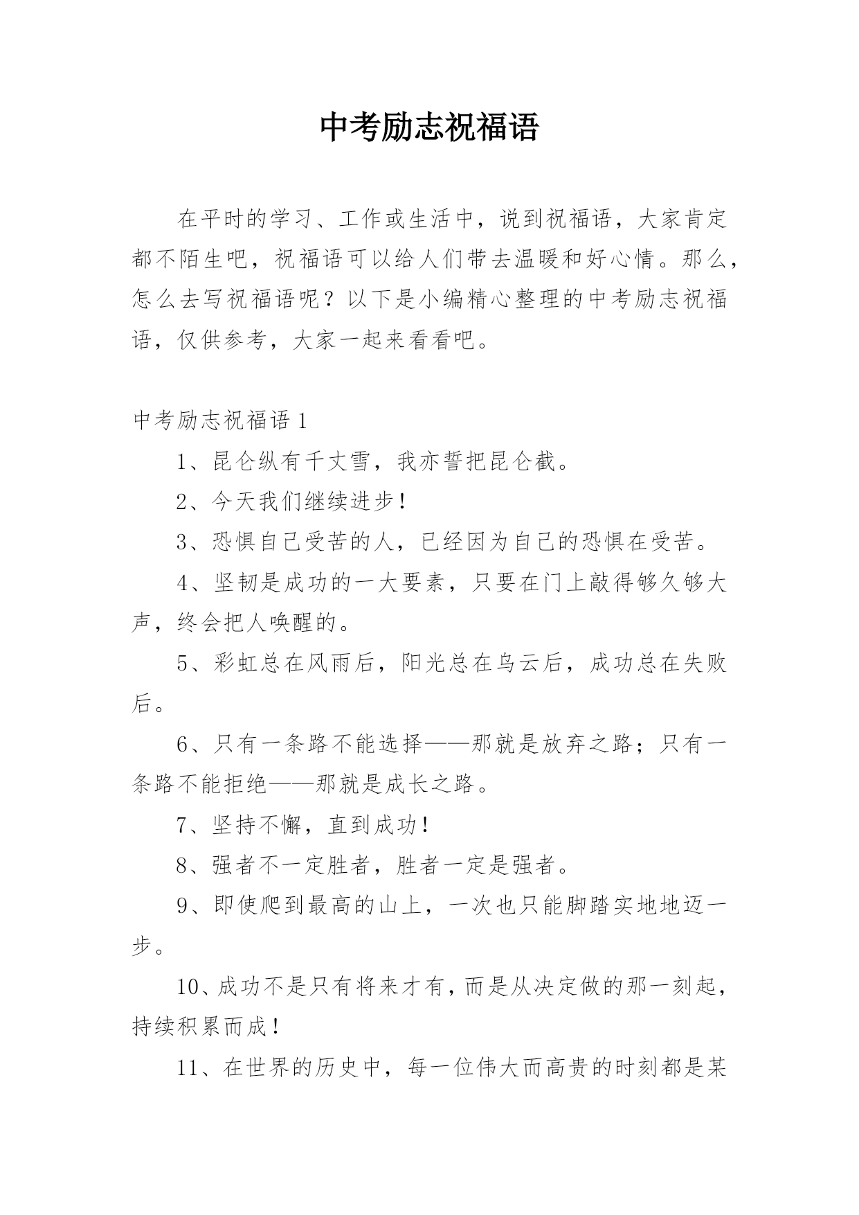 中考励志祝福语在平时的学习、工作或生活中,说到祝福语,大家肯定都不陌生吧,祝福语可以给人们带去温暖和好心情。那么,怎么去写祝福语呢?以下是小编精心整理的中考励志祝福语,仅供参考,大家一起来看看吧。中考励志祝福语11、昆仑纵有千丈雪,我亦誓把昆仑截。2、今天我们继续进步!3、恐惧自己受苦的人,已经因为自己的恐惧在受苦。4、坚韧是成功的一大要素,只要在门上敲得够久够大声,终会把人唤醒的。5、彩虹总在风雨后,阳光总在乌云后,成功总在失败后。6、只有一条路不能选择——那就是放弃之路;只有一条路不能拒绝——那就是成