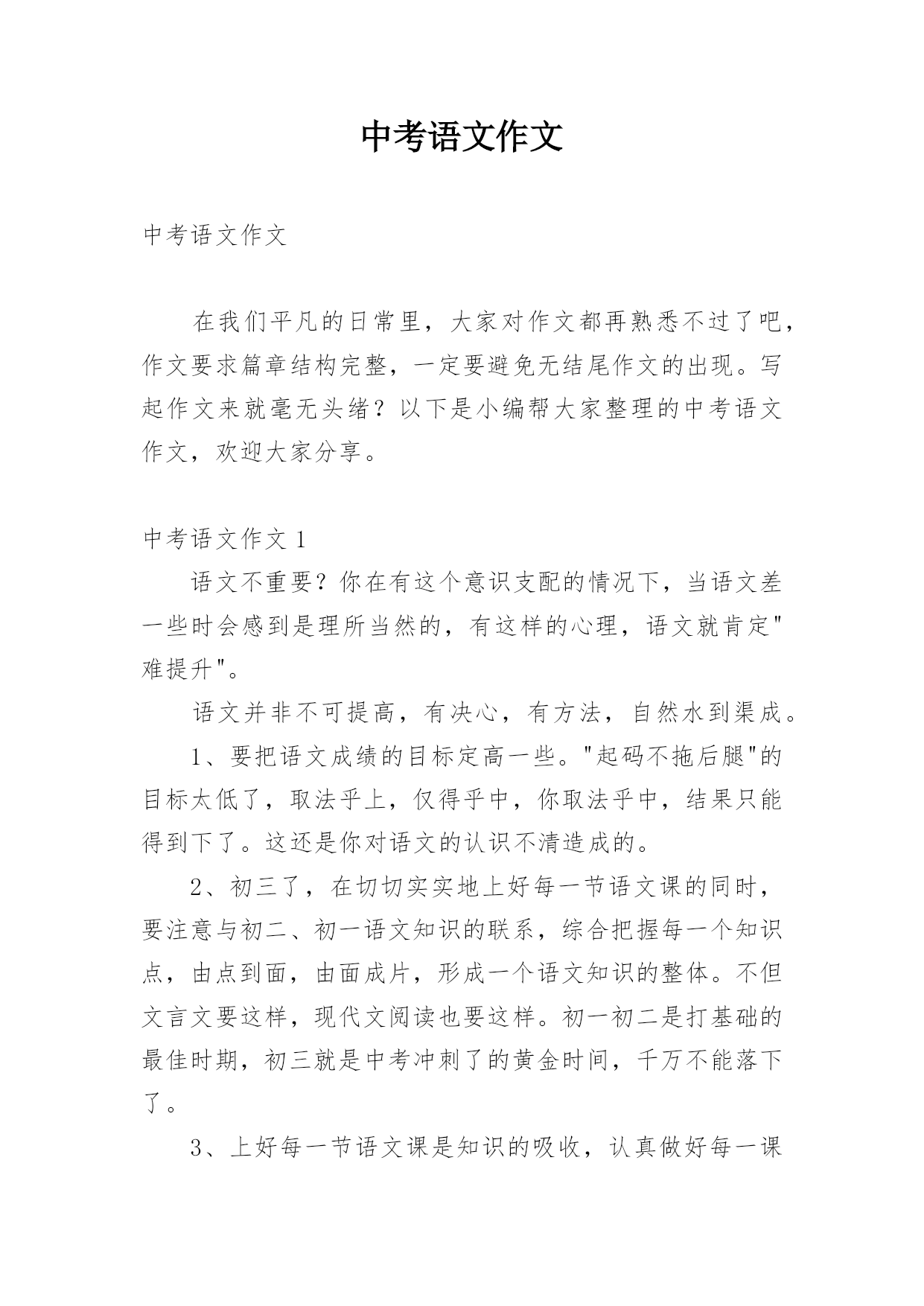中考语文作文中考语文作文在我们平凡的日常里,大家对作文都再熟悉不过了吧,作文要求篇章结构完整,一定要避免无结尾作文的出现。写起作文来就毫无头绪?以下是小编帮大家整理的中考语文作文,欢迎大家分享。中考语文作文1语文不重要?你在有这个意识支配的情况下,当语文差一些时会感到是理所当然的,有这样的心理,语文就肯定"难提升"。语文并非不可提高,有决心,有方法,自然水到渠成。1、要把语文成绩的目标定高一些。"起码不拖后腿"的目标太低了,取法乎上,仅得乎中,你取法乎中,结果只能得到下了。这还是你对语文的认识不清造成的。