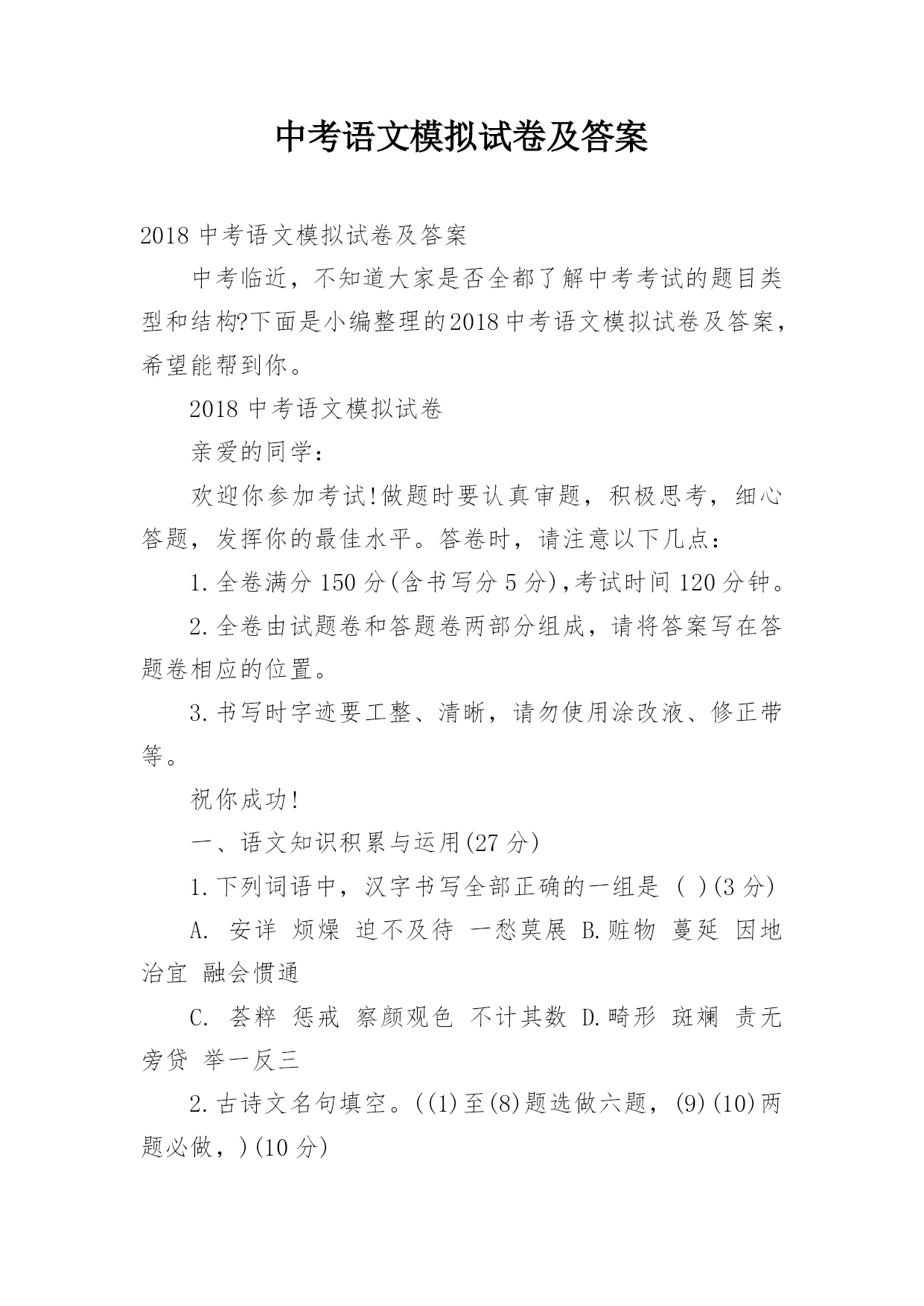 中考语文模拟试卷及答案2018中考语文模拟试卷及答案中考临近,不知道大家是否全都了解中考考试的题目类型和结构?下面是小编整理的2018中考语文模拟试卷及答案,希望能帮到你。2018中考语文模拟试卷亲爱的同学:欢迎你参加考试!做题时要认真审题,积极思考,细心答题,发挥你的最佳水平。答卷时,请注意以下几点:1.全卷满分150分(含书写分5分),考试时间120分钟。2.全卷由试题卷和答题卷两部分组成,请将答案写在答题卷相应的位置。3.书写时字迹要工整、清晰,请勿使用涂改液、修正带等。祝你成功!一、语文知识积累与