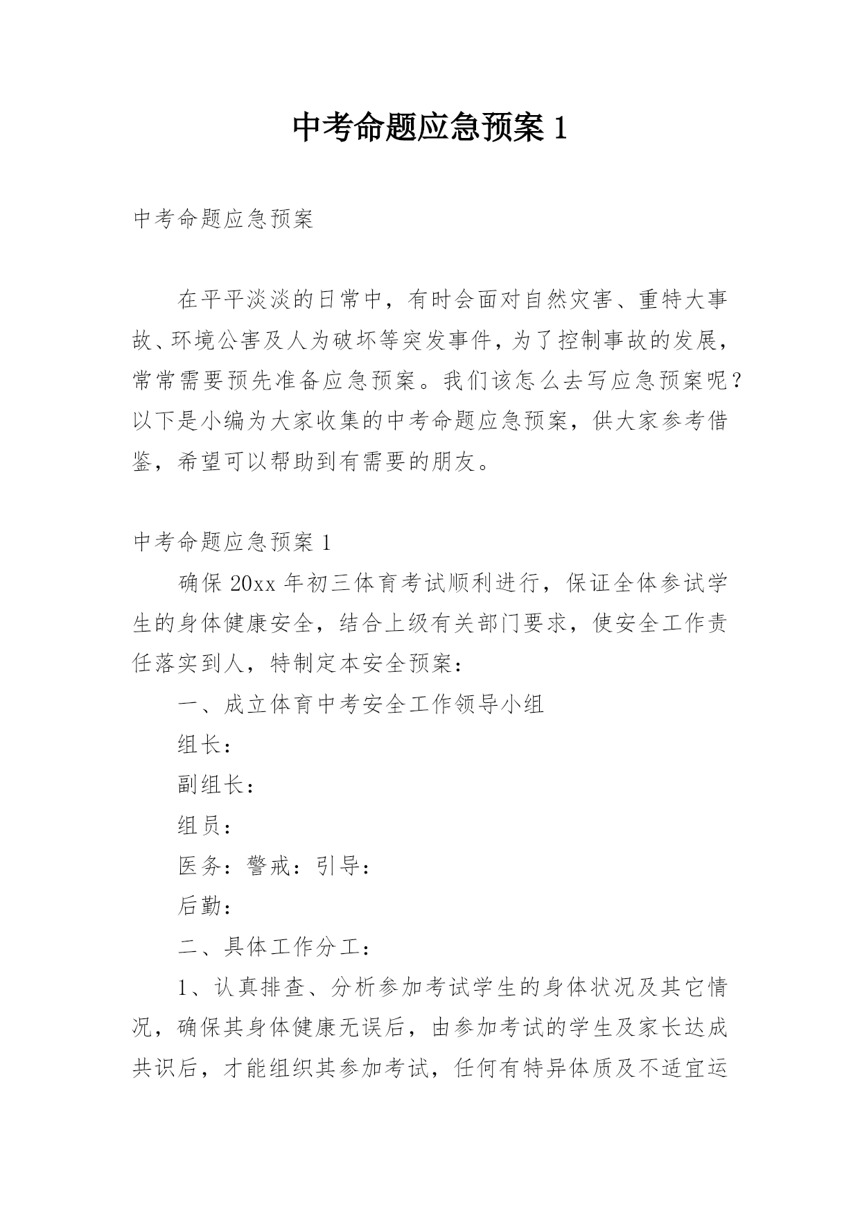中考命题应急预案1中考命题应急预案在平平淡淡的日常中,有时会面对自然灾害、重特大事故、环境公害及人为破坏等突发事件,为了控制事故的发展,常常需要预先准备应急预案。我们该怎么去写应急预案呢?以下是小编为大家收集的中考命题应急预案,供大家参考借鉴,希望可以帮助到有需要的朋友。中考命题应急预案1确保20xx年初三体育考试顺利进行,保证全体参试学生的身体健康安全,结合上级有关部门要求,使安全工作责任落实到人,特制定本安全预案:一、成立体育中考安全工作领导小组组长:副组长:组员:医务:警戒:引导:后勤:二、具体工作