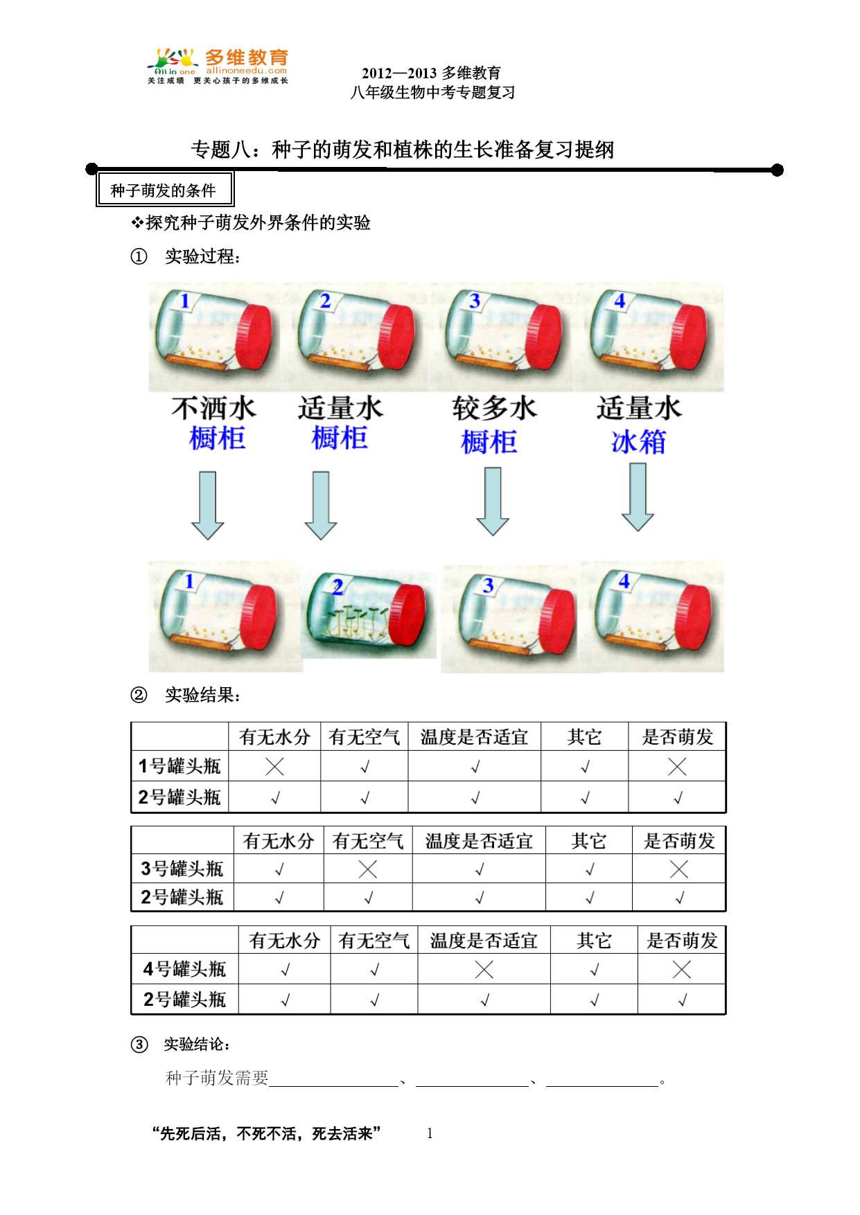 2012—2013多维教育八年级生物中考专题复习PAGE\*MERGEFORMAT5“先死后活,不死不活,死去活来”专题八:种子的萌发和植株的生长准备复习提纲种子萌发的条件探究种子萌发外界条件的实验实验过程:实验结果:实验结论:种子萌发需要、、。实验过程中的注意事项实验中应选择粒大饱满的种子每组应当选用多粒种子,这样可以减少偶然性在测算发芽率的时候要进行抽样调查,不能专门挑饱满的种子=4\*GB3\*MERGEFORMAT④种子的萌发(需要、不需要)光照,(需要、不需要)从外界吸收无机盐和有机