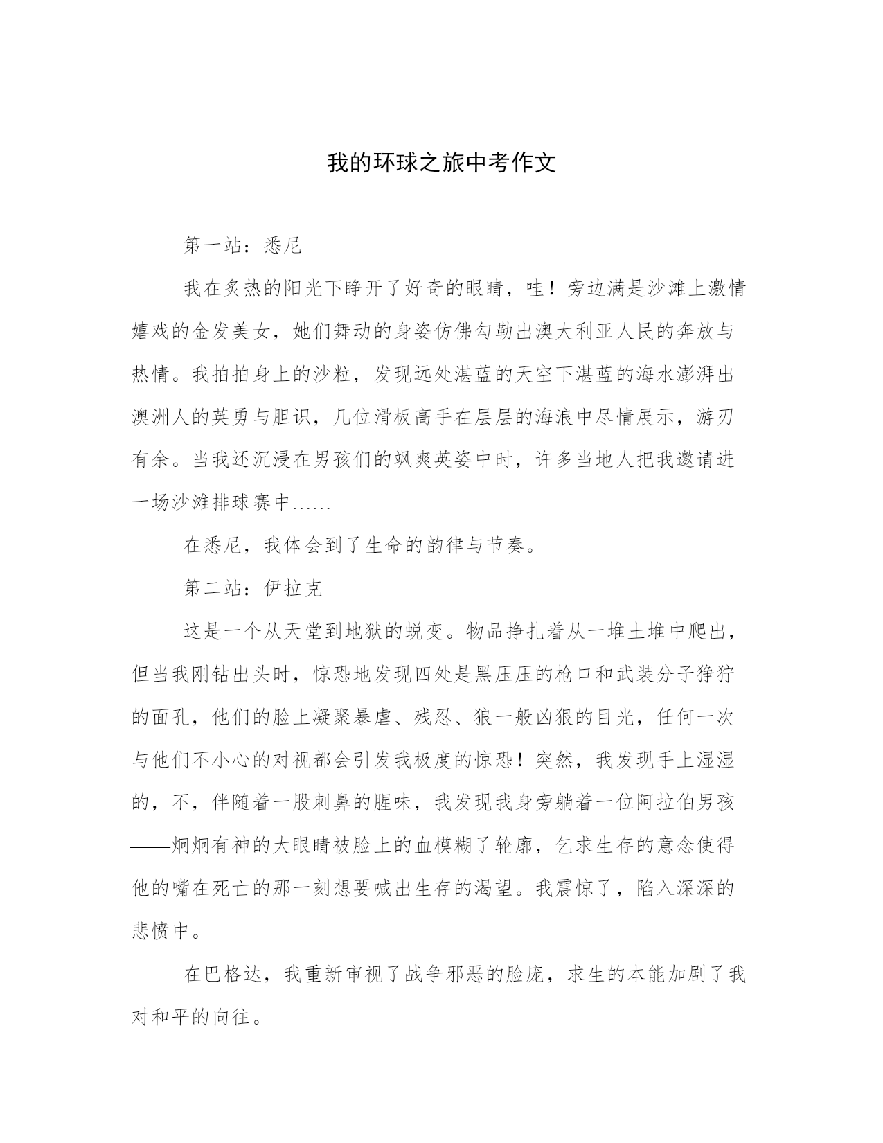 我的环球之旅中考作文第一站:悉尼我在炙热的阳光下睁开了好奇的眼睛,哇!旁边满是沙滩上激情嬉戏的金发美女,她们舞动的身姿仿佛勾勒出澳大利亚人民的奔放与热情。我拍拍身上的沙粒,发现远处湛蓝的天空下湛蓝的海水澎湃出澳洲人的英勇与胆识,几位滑板高手在层层的海浪中尽情展示,游刃有余。当我还沉浸在男孩们的飒爽英姿中时,许多当地人把我邀请进一场沙滩排球赛中……在悉尼,我体会到了生命的韵律与节奏。第二站:伊拉克这是一个从天堂到地狱的蜕变。物品挣扎着从一堆土堆中爬出,但当我刚钻出头时,惊恐地发现四处是黑压压的枪口和武装分子