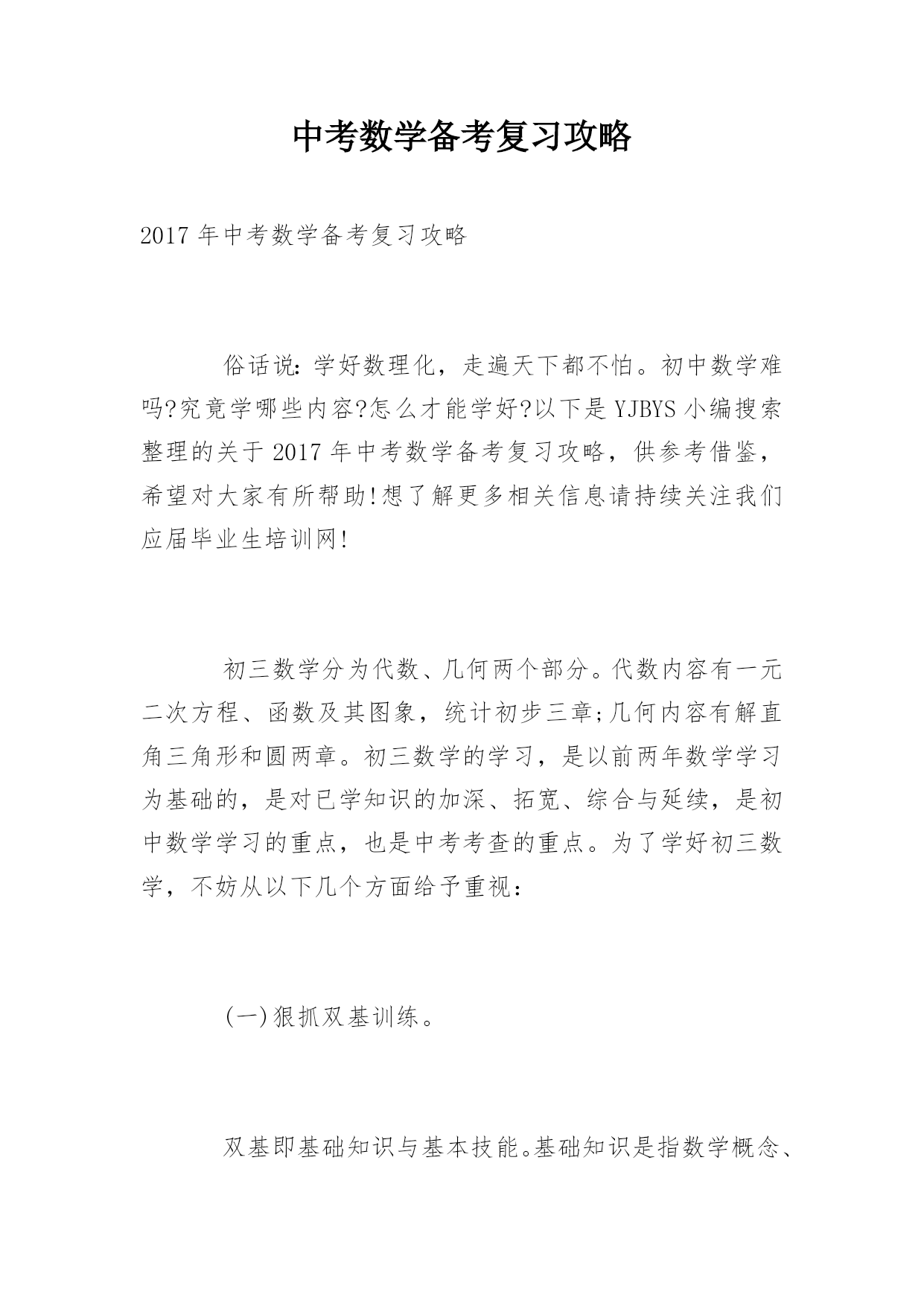 中考数学备考复习攻略2017年中考数学备考复习攻略俗话说:学好数理化,走遍天下都不怕。初中数学难吗?究竟学哪些内容?怎么才能学好?以下是YJBYS小编搜索整理的关于2017年中考数学备考复习攻略,供参考借鉴,希望对大家有所帮助!想了解更多相关信息请持续关注我们应届毕业生培训网!初三数学分为代数、几何两个部分。代数内容有一元二次方程、函数及其图象,统计初步三章;几何内容有解直角三角形和圆两章。初三数学的学习,是以前两年数学学习为基础的,是对已学知识的加深、拓宽、综合与延续,是初中数学学习的重点,也是中考考查