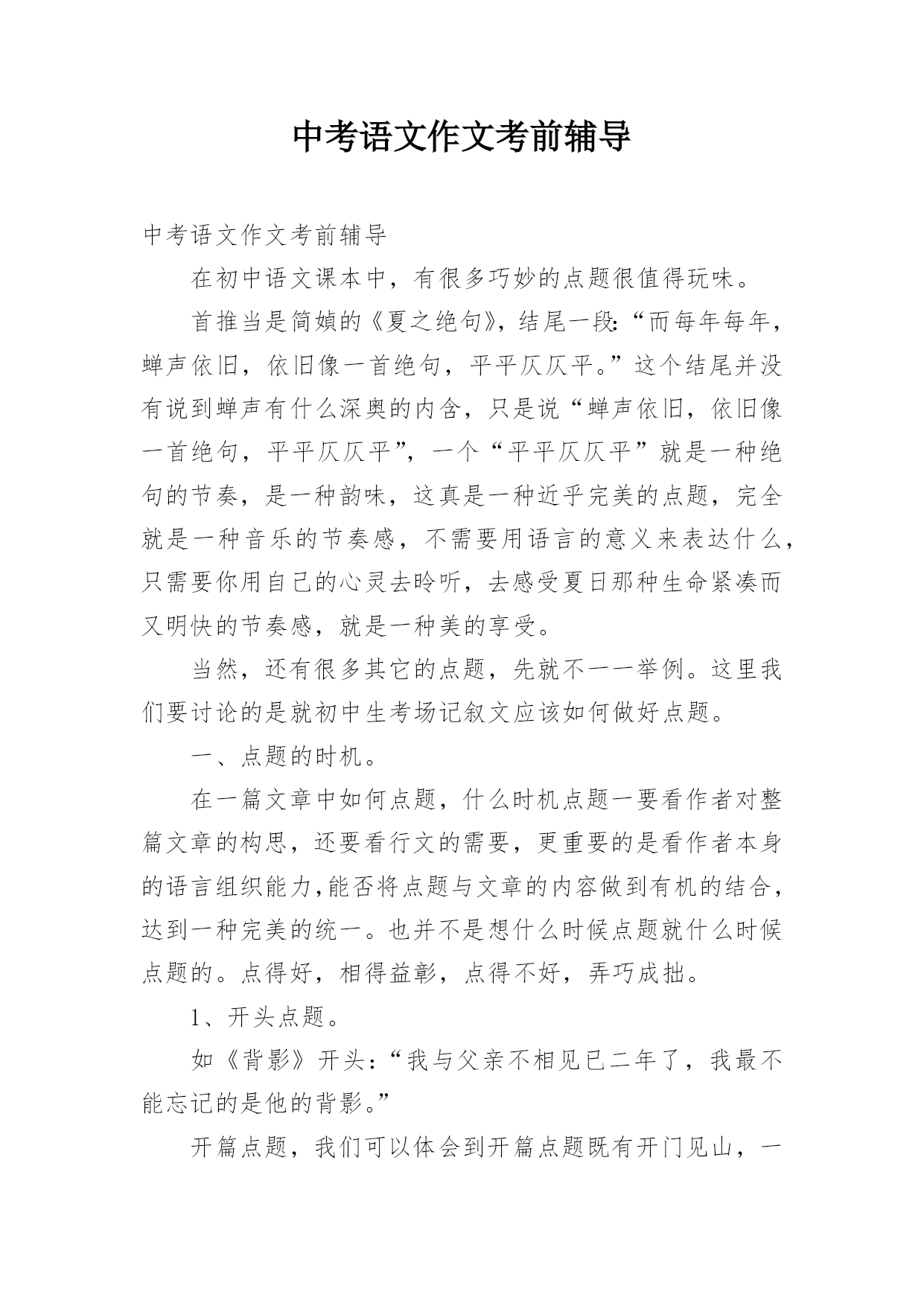 中考语文作文考前辅导中考语文作文考前辅导在初中语文课本中,有很多巧妙的点题很值得玩味。首推当是简媜的《夏之绝句》,结尾一段:“而每年每年,蝉声依旧,依旧像一首绝句,平平仄仄平。”这个结尾并没有说到蝉声有什么深奥的内含,只是说“蝉声依旧,依旧像一首绝句,平平仄仄平”,一个“平平仄仄平”就是一种绝句的节奏,是一种韵味,这真是一种近乎完美的点题,完全就是一种音乐的节奏感,不需要用语言的意义来表达什么,只需要你用自己的心灵去昤听,去感受夏日那种生命紧凑而又明快的节奏感,就是一种美的享受。当然,还有很多其它的点题,