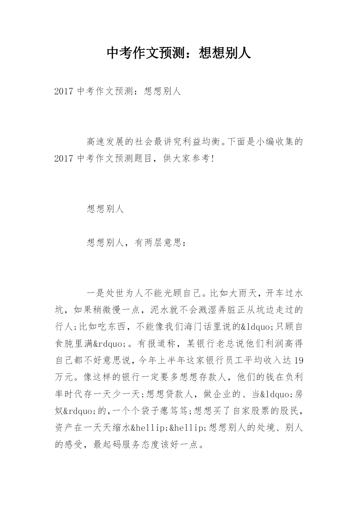 中考作文预测:想想别人2017中考作文预测:想想别人高速发展的社会最讲究利益均衡。下面是小编收集的2017中考作文预测题目,供大家参考!想想别人想想别人,有两层意思:一是处世为人不能光顾自己。比如大雨天,开车过水坑,如果稍微慢一点,泥水就不会溅湿弄脏正从坑边走过的行人;比如吃东西,不能像我们海门话里说的“只顾自食肫里满”。有报道称,某银行老总说他们利润高得自己都不好意思说,今年上半年这家银行员工平均收入达19万元。像这样的银行一定要多想想存款人,他们的钱在负利率时代存一天少一天;想