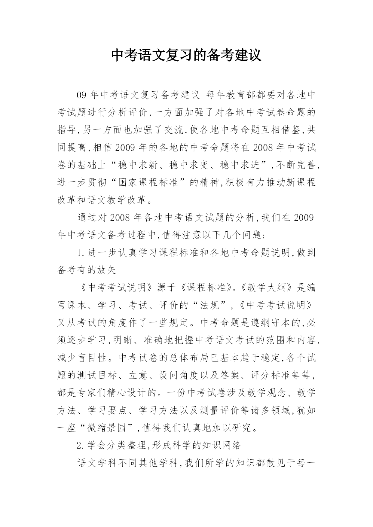 中考语文复习的备考建议09年中考语文复习备考建议每年教育部都要对各地中考试题进行分析评价,一方面加强了对各地中考试卷命题的指导,另一方面也加强了交流,使各地中考命题互相借鉴,共同提高,相信2009年的各地的中考命题将在2008年中考试卷的基础上“稳中求新、稳中求变、稳中求进”,不断完善,进一步贯彻“国家课程标准”的精神,积极有力推动新课程改革和语文教学改革。通过对2008年各地中考语文试题的分析,我们在2009年中考语文备考过程中,值得注意以下几个问题:1.进一步认真学习课程标准和各地中考命题说明,做到备