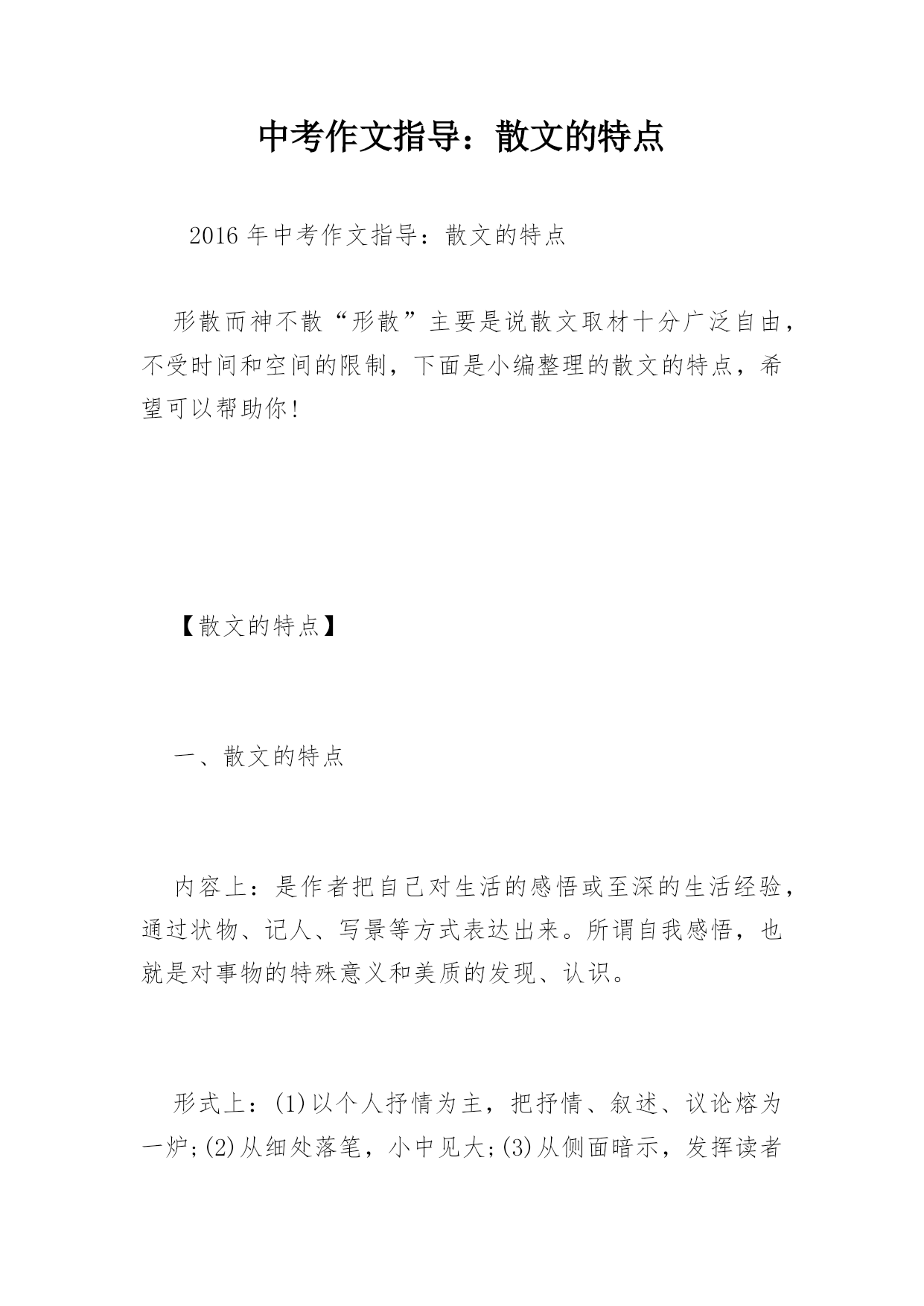 中考作文指导:散文的特点2016年中考作文指导:散文的特点形散而神不散“形散”主要是说散文取材十分广泛自由,不受时间和空间的限制,下面是小编整理的散文的特点,希望可以帮助你!【散文的特点】一、散文的特点内容上:是作者把自己对生活的感悟或至深的生活经验,通过状物、记人、写景等方式表达出来。所谓自我感悟,也就是对事物的特殊意义和美质的发现、认识。形式上:(1)以个人抒情为主,把抒情、叙述、议论熔为一炉;(2)从细处落笔,小中见大;(3)从侧面暗示,发挥读者的想象力;(4)行文自由,结构灵活。综合以上两点:散文