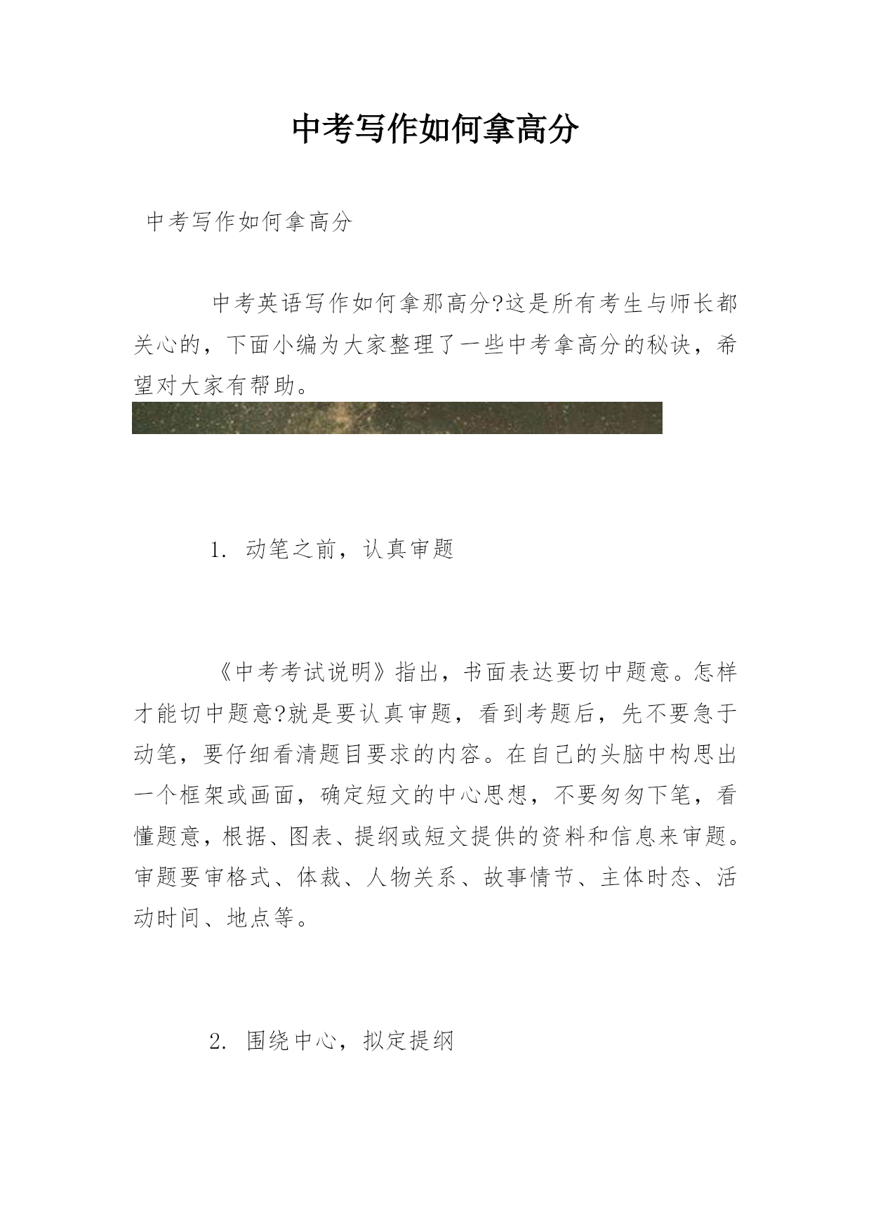 中考写作如何拿高分中考写作如何拿高分中考英语写作如何拿那高分?这是所有考生与师长都关心的,下面小编为大家整理了一些中考拿高分的秘诀,希望对大家有帮助。1.动笔之前,认真审题《中考考试说明》指出,书面表达要切中题意。怎样才能切中题意?就是要认真审题,看到考题后,先不要急于动笔,要仔细看清题目要求的内容。在自己的头脑中构思出一个框架或画面,确定短文的中心思想,不要匆匆下笔,看懂题意,根据、图表、提纲或短文提供的资料和信息来审题。审题要审格式、体裁、人物关系、故事情节、主体时态、活动时间、地点等。2.围绕中心,