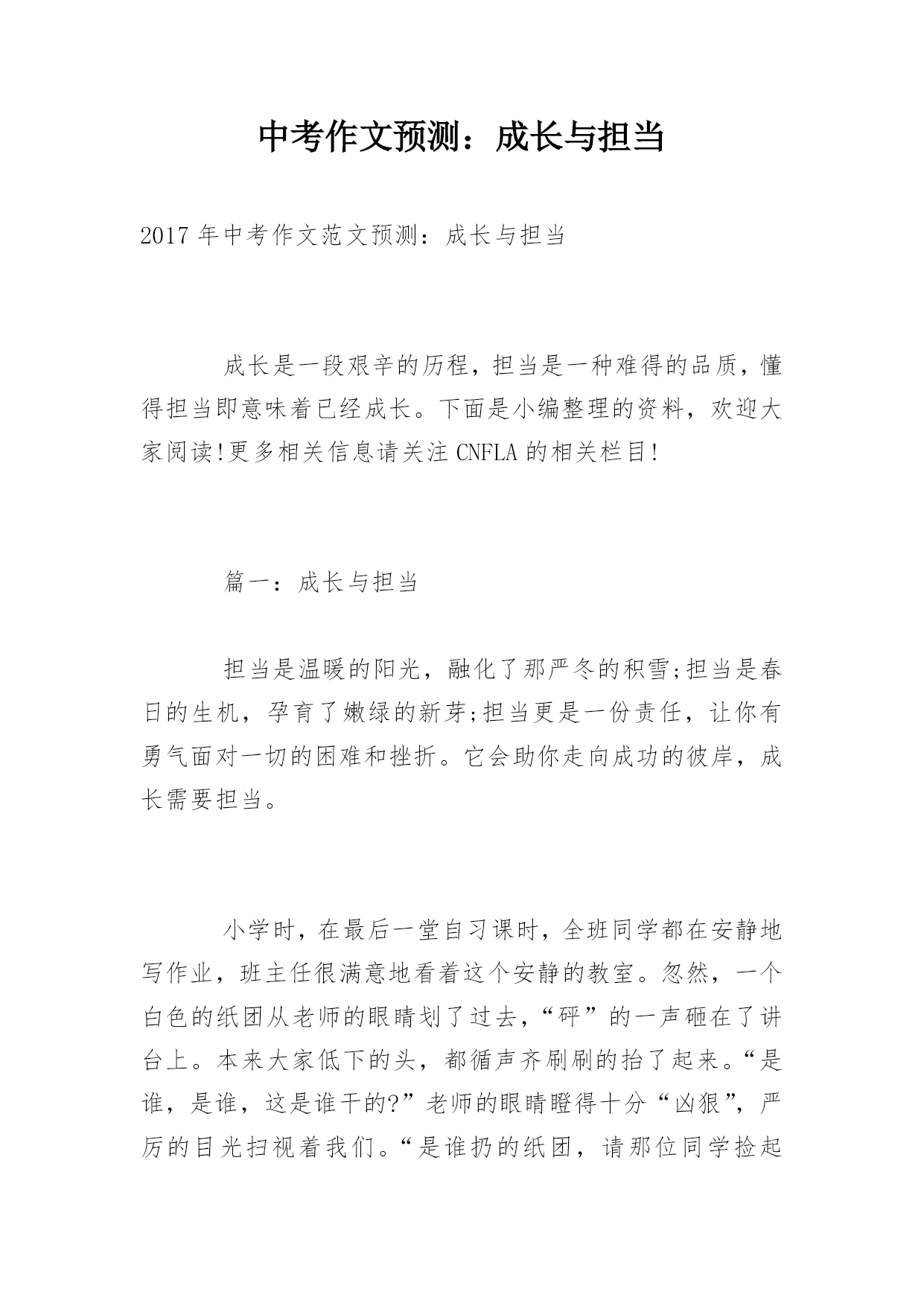 中考作文预测:成长与担当2017年中考作文范文预测:成长与担当成长是一段艰辛的历程,担当是一种难得的品质,懂得担当即意味着已经成长。下面是小编整理的资料,欢迎大家阅读!更多相关信息请关注CNFLA的相关栏目!篇一:成长与担当担当是温暖的阳光,融化了那严冬的积雪;担当是春日的生机,孕育了嫩绿的新芽;担当更是一份责任,让你有勇气面对一切的困难和挫折。它会助你走向成功的彼岸,成长需要担当。小学时,在最后一堂自习课时,全班同学都在安静地写作业,班主任很满意地看着这个安静的教室。忽然,一个白色的纸团从老师的眼睛划了