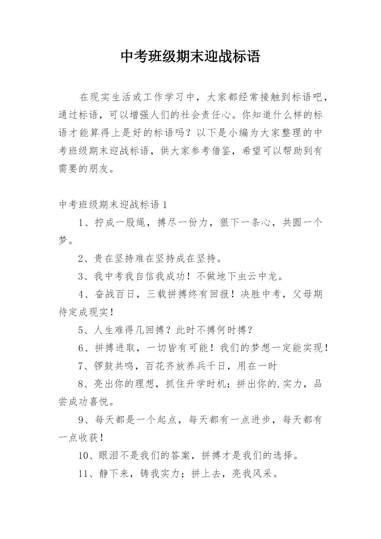 中考班级期末迎战标语在现实生活或工作学习中,大家都经常接触到标语吧,通过标语,可以增强人们的社会责任心。你知道什么样的标语才能算得上是好的标语吗?以下是小编为大家整理的中考班级期末迎战标语,供大家参考借鉴,希望可以帮助到有需要的朋友。中考班级期末迎战标语11、拧成一股绳,搏尽一份力,狠下一条心,共圆一个梦。2、贵在坚持难在坚持成在坚持。3、我中考我自信我成功!不做地下虫云中龙。4、奋战百日,三载拼搏终有回报!决胜中考,父母期待定成现实!5、人生难得几回搏?此时不搏何时搏?6、拼搏进取,一切皆有可能!我们的