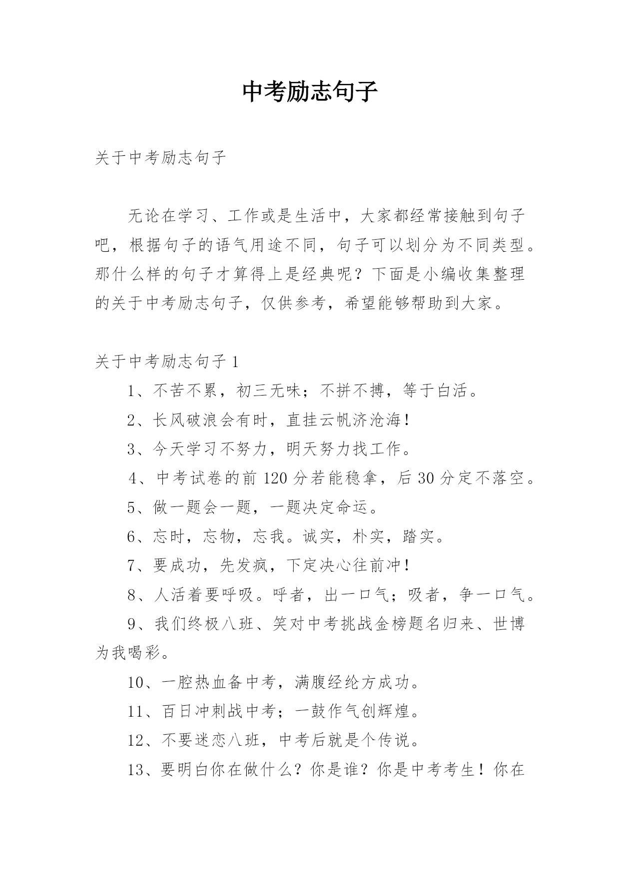 中考励志句子关于中考励志句子无论在学习、工作或是生活中,大家都经常接触到句子吧,根据句子的语气用途不同,句子可以划分为不同类型。那什么样的句子才算得上是经典呢?下面是小编收集整理的关于中考励志句子,仅供参考,希望能够帮助到大家。关于中考励志句子11、不苦不累,初三无味;不拼不搏,等于白活。2、长风破浪会有时,直挂云帆济沧海!3、今天学习不努力,明天努力找工作。4、中考试卷的前120分若能稳拿,后30分定不落空。5、做一题会一题,一题决定命运。6、忘时,忘物,忘我。诚实,朴实,踏实。7、要成功,先发疯,下定