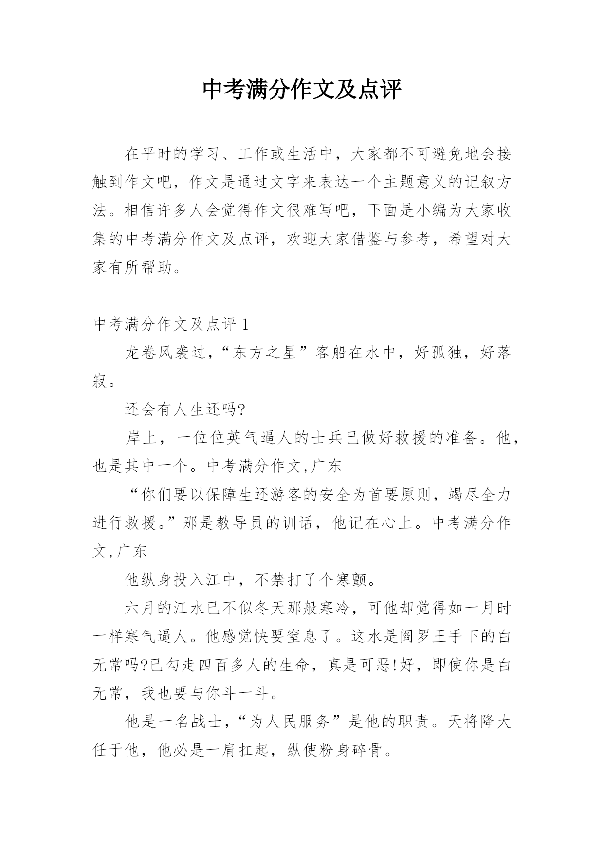 中考满分作文及点评在平时的学习、工作或生活中,大家都不可避免地会接触到作文吧,作文是通过文字来表达一个主题意义的记叙方法。相信许多人会觉得作文很难写吧,下面是小编为大家收集的中考满分作文及点评,欢迎大家借鉴与参考,希望对大家有所帮助。中考满分作文及点评1龙卷风袭过,“东方之星”客船在水中,好孤独,好落寂。还会有人生还吗?岸上,一位位英气逼人的士兵已做好救援的准备。他,也是其中一个。中考满分作文,广东“你们要以保障生还游客的安全为首要原则,竭尽全力进行救援。”那是教导员的训话,他记在心上。中考满分作文,广东