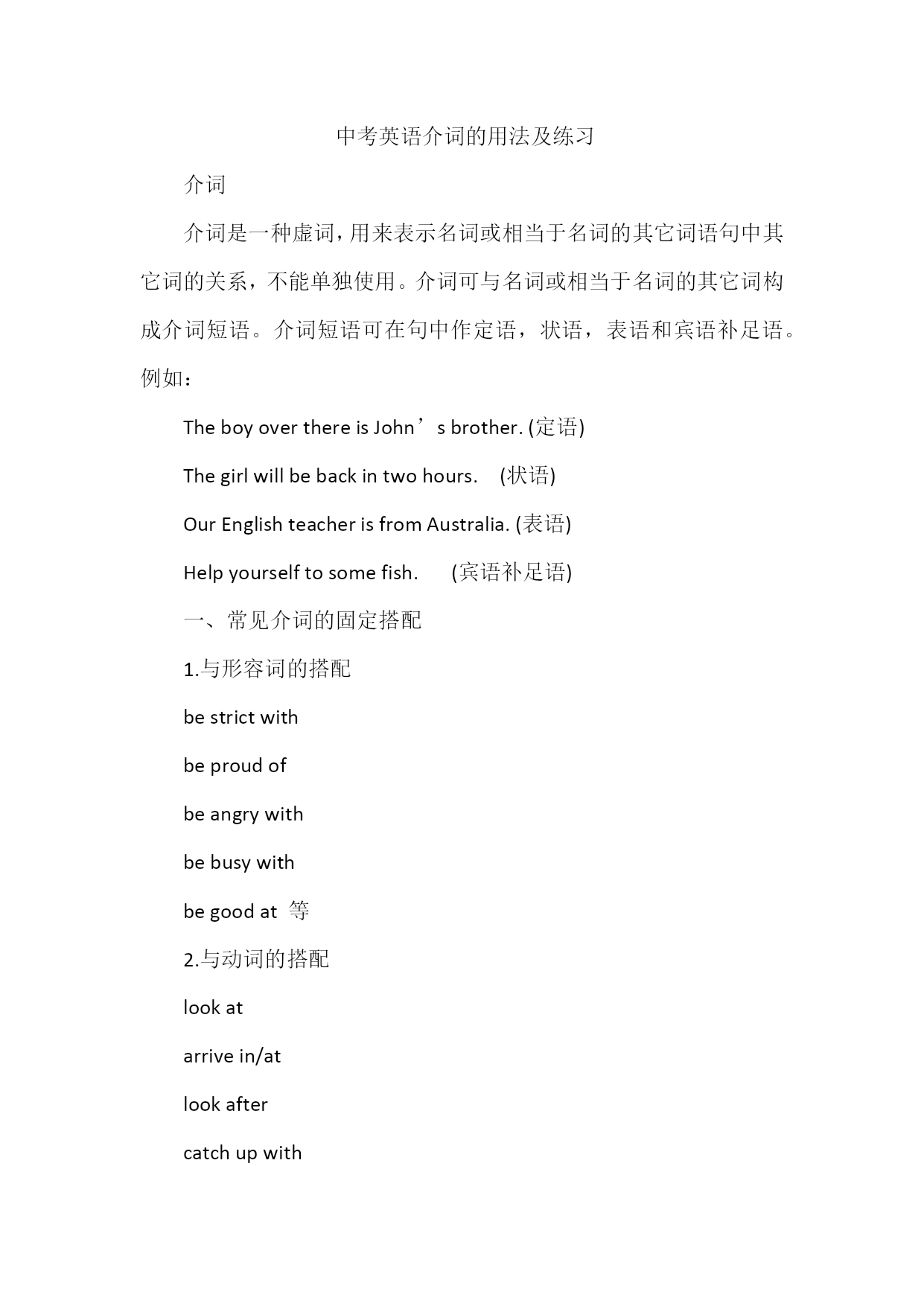中考英语介词的用法及练习介词介词是一种虚词,用来表示名词或相当于名词的其它词语句中其它词的关系,不能单独使用。介词可与名词或相当于名词的其它词构成介词短语。介词短语可在句中作定语,状语,表语和宾语补足语。例如:TheboyoverthereisJohn’sbrother.(定语)Thegirlwillbebackintwohours.(状语)OurEnglishteacherisfromAustralia.(表语)Helpyourselftosomefish.(宾语补足语)一、常见介词的固定搭配1.与形容