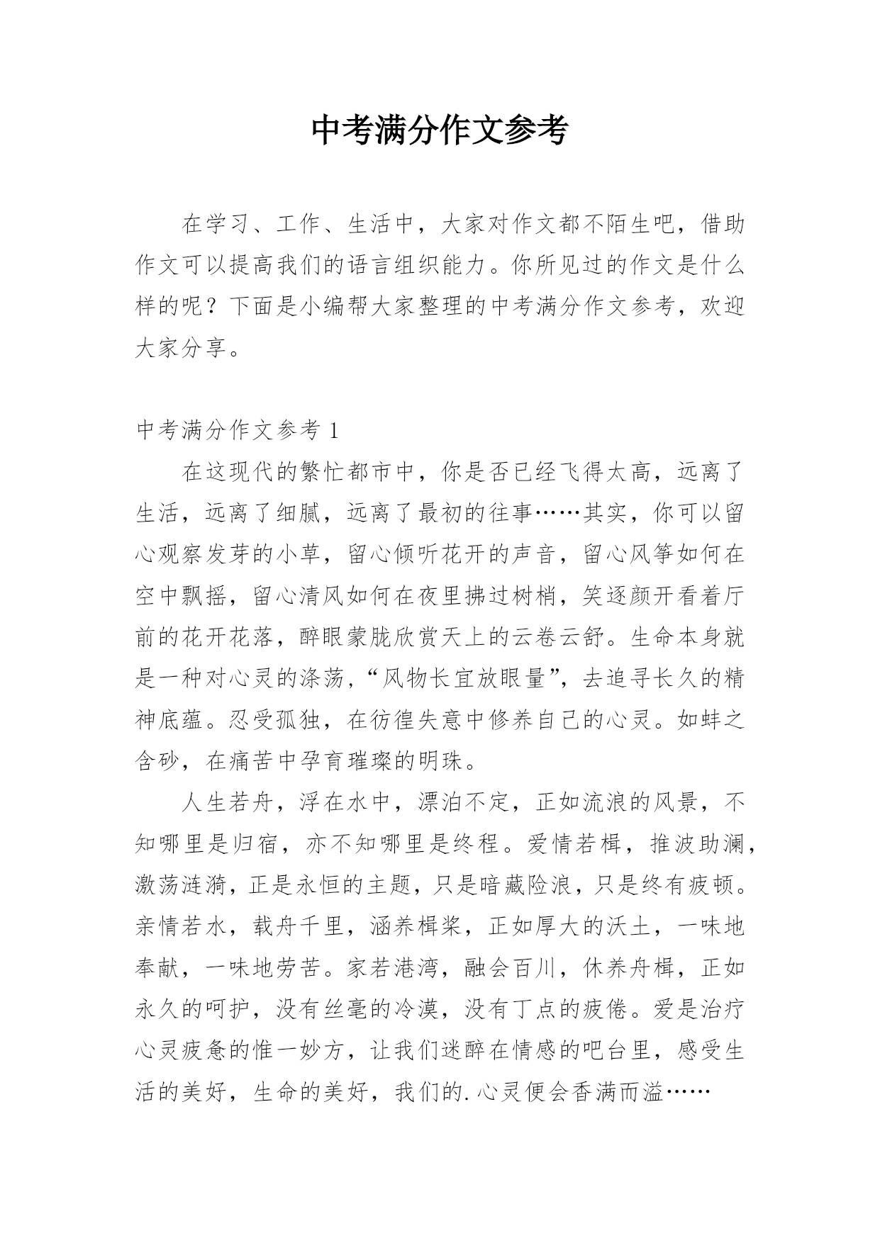 中考满分作文参考在学习、工作、生活中,大家对作文都不陌生吧,借助作文可以提高我们的语言组织能力。你所见过的作文是什么样的呢?下面是小编帮大家整理的中考满分作文参考,欢迎大家分享。中考满分作文参考1在这现代的繁忙都市中,你是否已经飞得太高,远离了生活,远离了细腻,远离了最初的往事……其实,你可以留心观察发芽的小草,留心倾听花开的声音,留心风筝如何在空中飘摇,留心清风如何在夜里拂过树梢,笑逐颜开看着厅前的花开花落,醉眼蒙胧欣赏天上的云卷云舒。生命本身就是一种对心灵的涤荡,“风物长宜放眼量”,去追寻长久的精神底