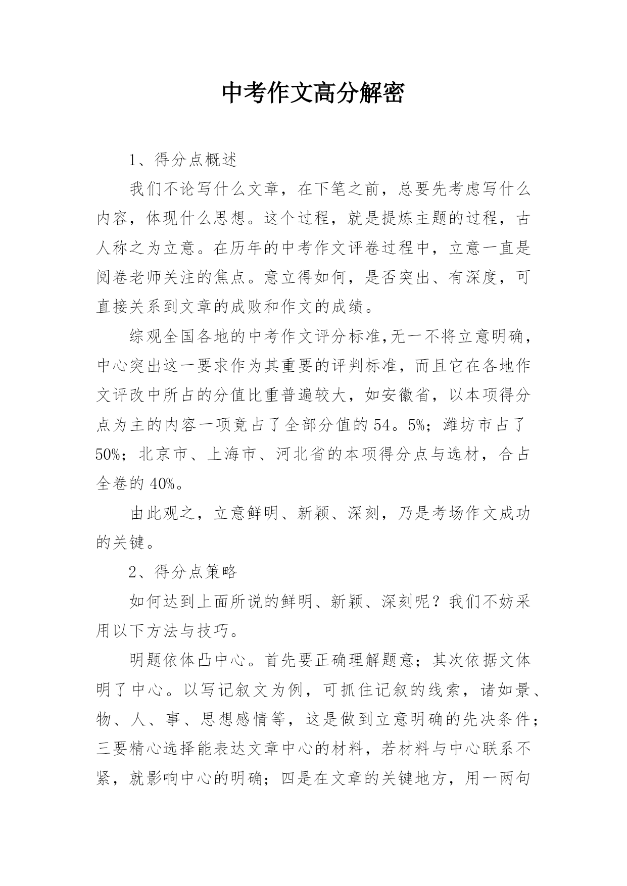 中考作文高分解密1、得分点概述我们不论写什么文章,在下笔之前,总要先考虑写什么内容,体现什么思想。这个过程,就是提炼主题的过程,古人称之为立意。在历年的中考作文评卷过程中,立意一直是阅卷老师关注的焦点。意立得如何,是否突出、有深度,可直接关系到文章的成败和作文的成绩。综观全国各地的中考作文评分标准,无一不将立意明确,中心突出这一要求作为其重要的评判标准,而且它在各地作文评改中所占的分值比重普遍较大,如安徽省,以本项得分点为主的内容一项竟占了全部分值的54。5%;潍坊市占了50%;北京市、上海市、河北省的本