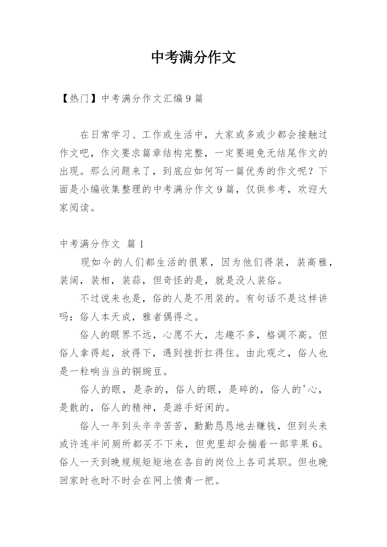 中考满分作文【热门】中考满分作文汇编9篇在日常学习、工作或生活中,大家或多或少都会接触过作文吧,作文要求篇章结构完整,一定要避免无结尾作文的出现。那么问题来了,到底应如何写一篇优秀的作文呢?下面是小编收集整理的中考满分作文9篇,仅供参考,欢迎大家阅读。中考满分作文篇1现如今的人们都生活的很累,因为他们得装,装高雅,装阔,装相,装蒜,但奇怪的是,就是没人装俗。不过说来也是,俗的人是不用装的。有句话不是这样讲吗:俗人本天成,雅者偶得之。俗人的眼界不远,心愿不大,志趣不多,格调不高。但俗人拿得起,放得下,遇到挫