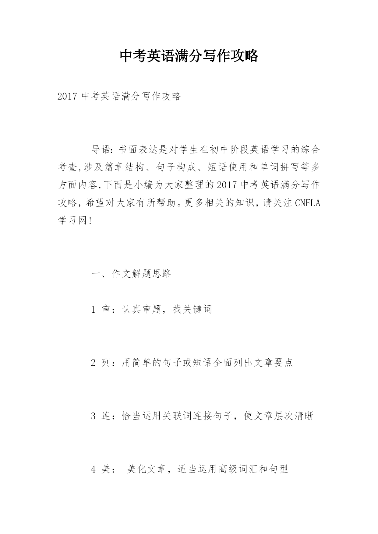 中考英语满分写作攻略2017中考英语满分写作攻略导语:书面表达是对学生在初中阶段英语学习的综合考查,涉及篇章结构、句子构成、短语使用和单词拼写等多方面内容,下面是小编为大家整理的2017中考英语满分写作攻略,希望对大家有所帮助。更多相关的知识,请关注CNFLA学习网!一、作文解题思路1审:认真审题,找关键词2列:用简单的句子或短语全面列出文章要点3连:恰当运用关联词连接句子,使文章层次清晰4美:美化文章,适当运用高级词汇和句型二、作文方法点睛1.运用高级词汇①固定短语和固定搭配的使用→我不知道如何扩大我的