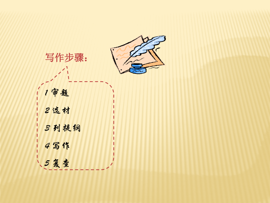 第一步审题例2:Iwanttodosomethingformyschool例3:学校的“Englishcenter”是同学们练习英语的场所。这里的“teenagerhotline”每天都能收不到不少同学的咨询电话。作为热线的一名志愿者,请你根据当时的记录,首先描述两位同学遇到的问题,然后给一位同学提出具体建议并说明原因。主要内容:问题、建议、原因限制:描述两位同学的问题,给一位同学提建议关键词:problem、suggestion、reasondobadinsports注意“四定”第三步列提纲例1:利弊型