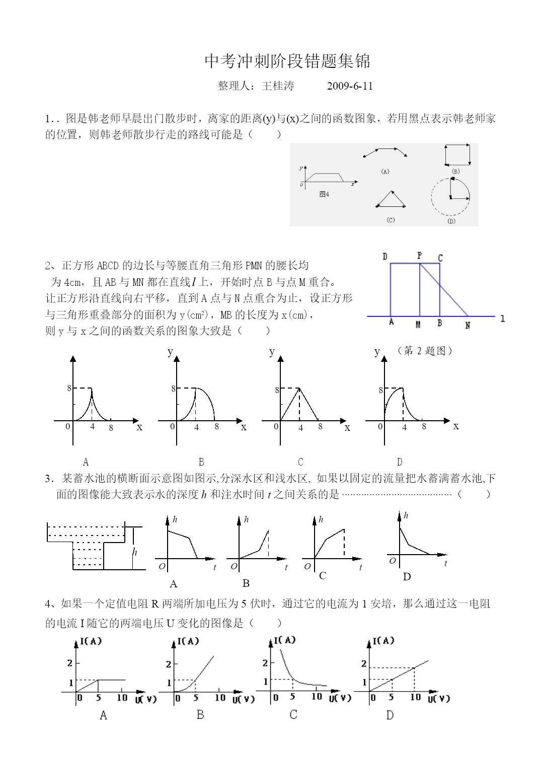 中考冲刺阶段错题集锦整理人:王桂涛2009-6-111..图是韩老师早晨出门散步时,离家的距离(y)与(x)之间的函数图象,若用黑点表示韩老师家的位置,则韩老师散步行走的路线可能是()(第2题图)2、正方形ABCD的边长与等腰直角三角形PMN的腰长均为4cm,且AB与MN都在直线上,开始时点B与点M重合。让正方形沿直线向右平移,直到A点与N点重合为止,设正方形与三角形重叠部分的面积为y(cm2),MB的长度为x(cm),则y与x之间的函数关系的图象大致是()yyy8888000044448888xxxxA