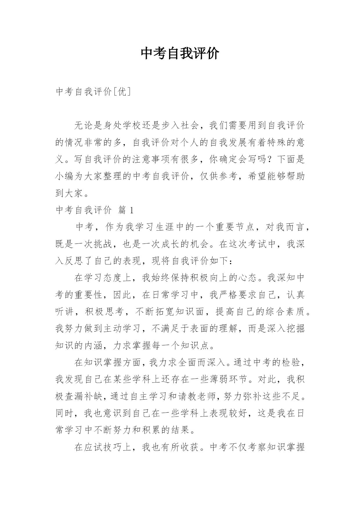 中考自我评价中考自我评价[优]无论是身处学校还是步入社会,我们需要用到自我评价的情况非常的多,自我评价对个人的自我发展有着特殊的意义。写自我评价的注意事项有很多,你确定会写吗?下面是小编为大家整理的中考自我评价,仅供参考,希望能够帮助到大家。中考自我评价篇1中考,作为我学习生涯中的一个重要节点,对我而言,既是一次挑战,也是一次成长的机会。在这次考试中,我深入反思了自己的表现,现将自我评价如下:在学习态度上,我始终保持积极向上的心态。我深知中考的重要性,因此,在日常学习中,我严格要求自己,认真听讲,积极思考