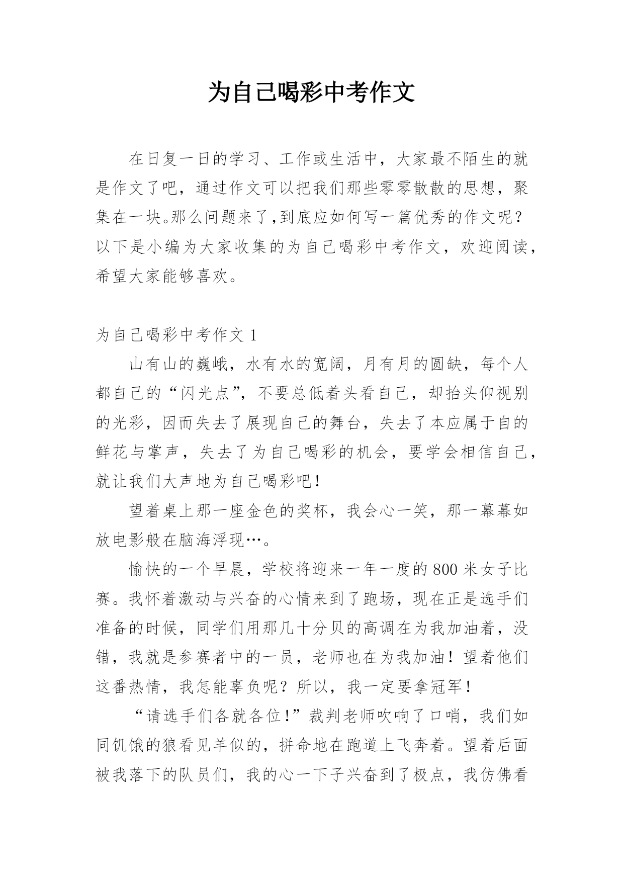 为自己喝彩中考作文在日复一日的学习、工作或生活中,大家最不陌生的就是作文了吧,通过作文可以把我们那些零零散散的思想,聚集在一块。那么问题来了,到底应如何写一篇优秀的作文呢?以下是小编为大家收集的为自己喝彩中考作文,欢迎阅读,希望大家能够喜欢。为自己喝彩中考作文1山有山的巍峨,水有水的宽阔,月有月的圆缺,每个人都自己的“闪光点”,不要总低着头看自己,却抬头仰视别的光彩,因而失去了展现自己的舞台,失去了本应属于自的鲜花与掌声,失去了为自己喝彩的机会,要学会相信自己,就让我们大声地为自己喝彩吧!望着桌上那一座金