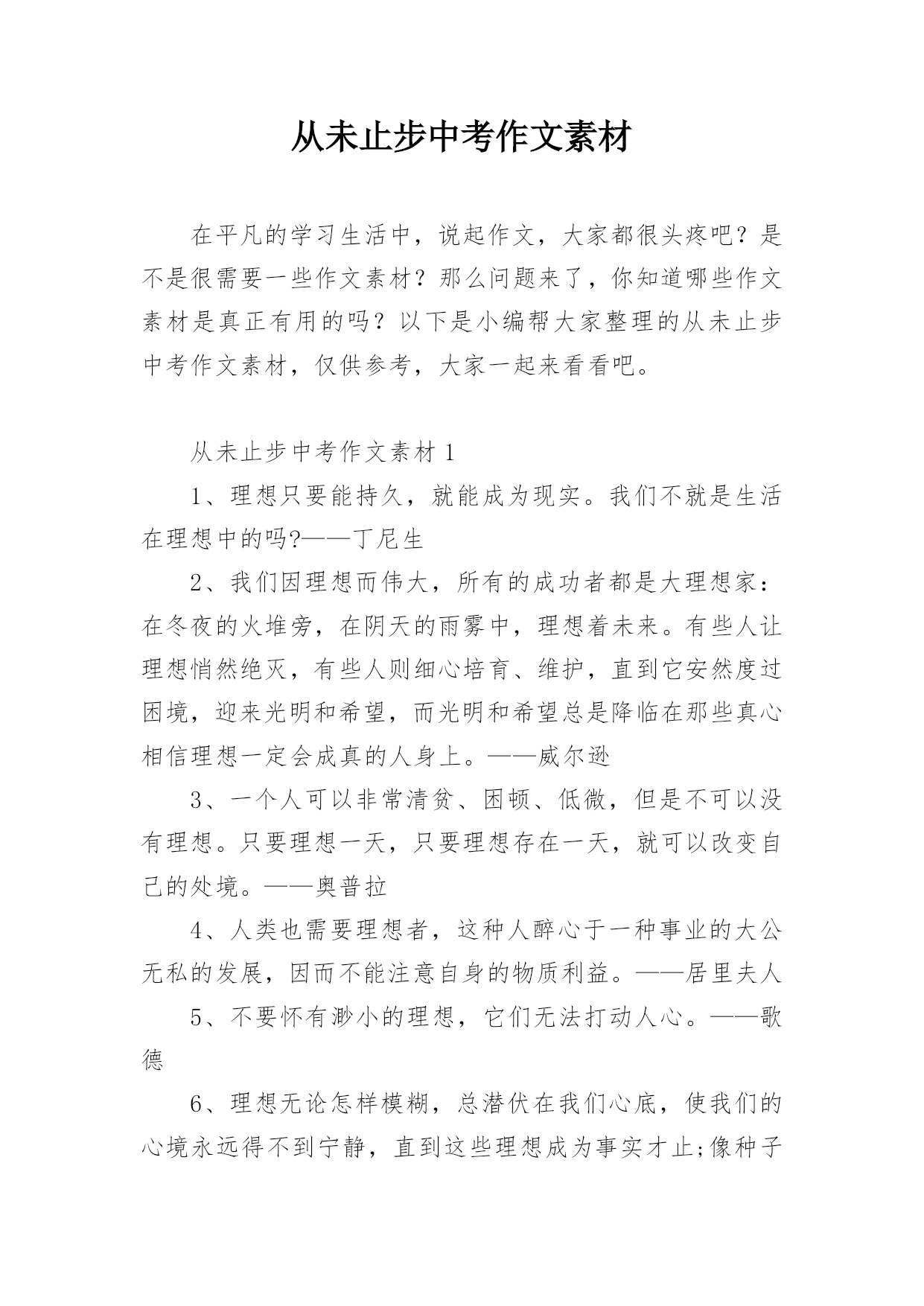 从未止步中考作文素材在平凡的学习生活中,说起作文,大家都很头疼吧?是不是很需要一些作文素材?那么问题来了,你知道哪些作文素材是真正有用的吗?以下是小编帮大家整理的从未止步中考作文素材,仅供参考,大家一起来看看吧。从未止步中考作文素材11、理想只要能持久,就能成为现实。我们不就是生活在理想中的吗?——丁尼生2、我们因理想而伟大,所有的成功者都是大理想家:在冬夜的火堆旁,在阴天的雨雾中,理想着未来。有些人让理想悄然绝灭,有些人则细心培育、维护,直到它安然度过困境,迎来光明和希望,而光明和希望总是降临在那些真心