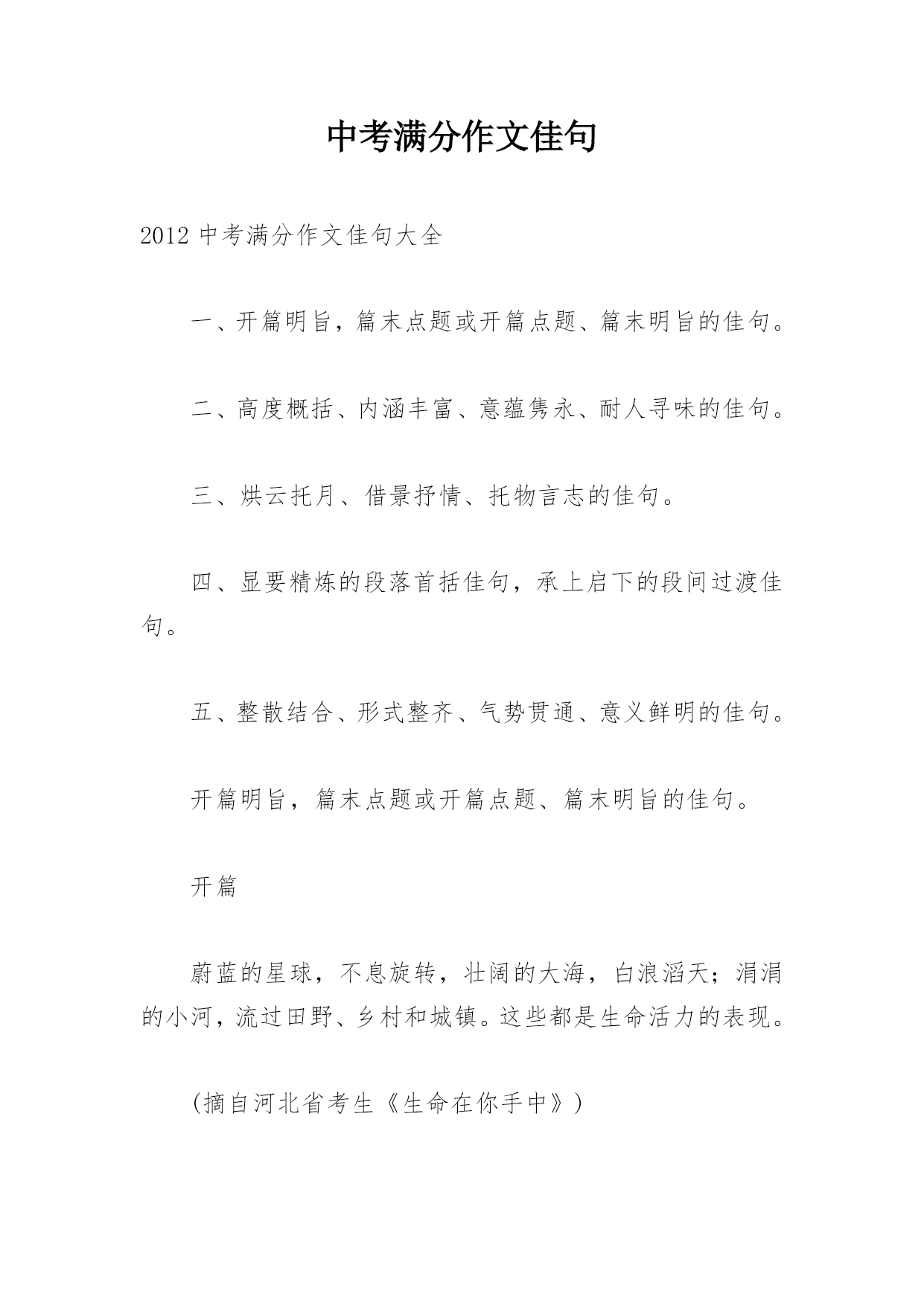 中考满分作文佳句2012中考满分作文佳句大全一、开篇明旨,篇末点题或开篇点题、篇末明旨的佳句。二、高度概括、内涵丰富、意蕴隽永、耐人寻味的佳句。三、烘云托月、借景抒情、托物言志的佳句。四、显要精炼的段落首括佳句,承上启下的段间过渡佳句。五、整散结合、形式整齐、气势贯通、意义鲜明的佳句。开篇明旨,篇末点题或开篇点题、篇末明旨的佳句。开篇蔚蓝的星球,不息旋转,壮阔的大海,白浪滔天;涓涓的小河,流过田野、乡村和城镇。这些都是生命活力的表现。(摘自河北省考生《生命在你手中》)青春的风铃,吹开了心扉,青春的彩笛,吹