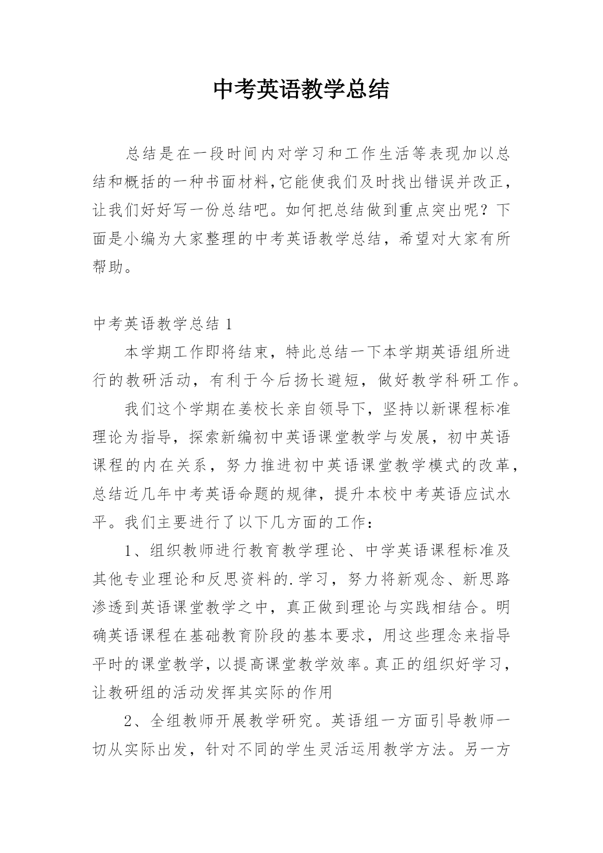 中考英语教学总结总结是在一段时间内对学习和工作生活等表现加以总结和概括的一种书面材料,它能使我们及时找出错误并改正,让我们好好写一份总结吧。如何把总结做到重点突出呢?下面是小编为大家整理的中考英语教学总结,希望对大家有所帮助。中考英语教学总结1本学期工作即将结束,特此总结一下本学期英语组所进行的教研活动,有利于今后扬长避短,做好教学科研工作。我们这个学期在姜校长亲自领导下,坚持以新课程标准理论为指导,探索新编初中英语课堂教学与发展,初中英语课程的内在关系,努力推进初中英语课堂教学模式的改革,总结近几年中考