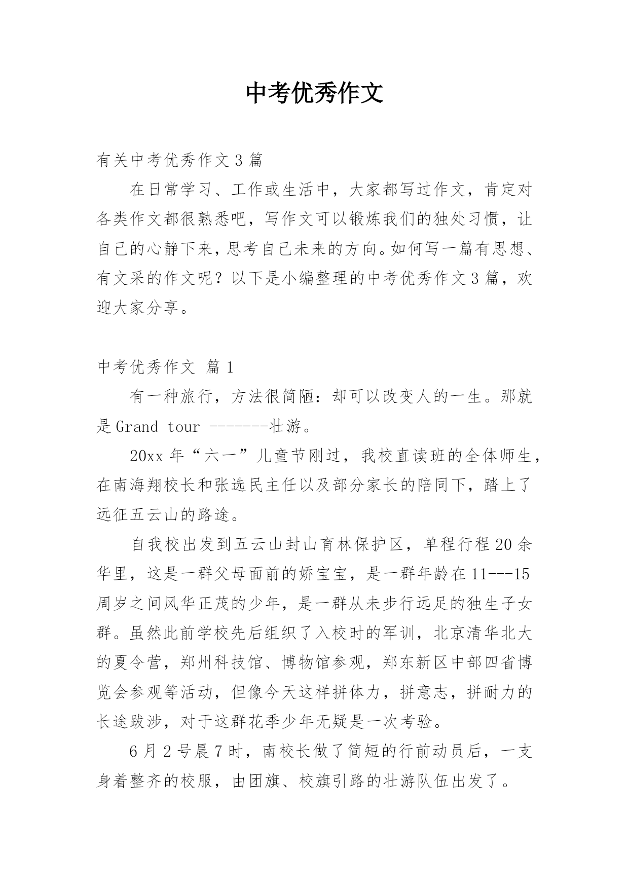 中考优秀作文有关中考优秀作文3篇在日常学习、工作或生活中,大家都写过作文,肯定对各类作文都很熟悉吧,写作文可以锻炼我们的独处习惯,让自己的心静下来,思考自己未来的方向。如何写一篇有思想、有文采的作文呢?以下是小编整理的中考优秀作文3篇,欢迎大家分享。中考优秀作文篇1有一种旅行,方法很简陋:却可以改变人的一生。那就是Grandtour-------壮游。20xx年“六一”儿童节刚过,我校直读班的全体师生,在南海翔校长和张选民主任以及部分家长的陪同下,踏上了远征五云山的路途。自我校出发到五云山封山育林保护区,