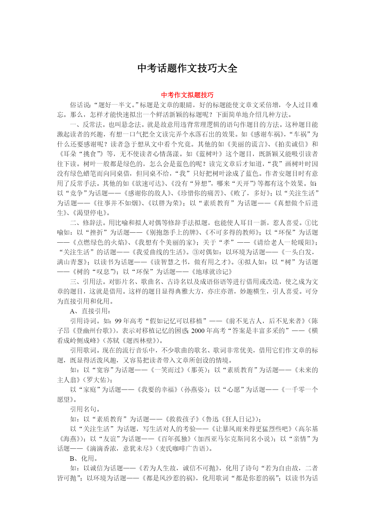 中考话题作文技巧大全中考作文拟题技巧俗话说:“题好一半文。”标题是文章的眼睛,好的标题能使文章文采倍增,令人过目难忘。那么,怎样才能快速拟出一个鲜活新颖的标题呢?下面简单地介绍几种方法。一、反常法。也叫悬念法。就是故意用违背常理逻辑的语句作题目的方法。这种题目能激起读者的兴趣,有想一口气把全文读完弄个水落石出的效果。如《感谢车祸》,“车祸”为什么还要感谢呢?读者急于想从文中看个究竟。其他的如《美丽的谎言》、《拍卖诚信》和《耳朵“挑食”》等,无不使读者心情荡漾。如《蓝树叶》这个题目,既新颖又能吸引读者往下读