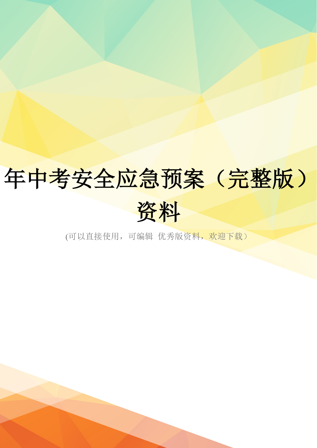 年中考安全应急预案(完整版)资料(可以直接使用,可编辑优秀版资料,欢迎下载)2021年中考安全应急预案一年一度的中考即将来临,为保证中考的顺利进行,确保考试期间学生的健康安全,考试纪律良好,有效地处理各类突发事件,预防各种事故的发生,确保中考安全有序的圆满完成,根据县教育局有关精神,结合我校实际情况,特制定本安全预案。一、加强安全工作组织领导学校成立以年级长为组长的安全管理领导小组,全面负责中考工作。组长负责统一指挥,做好统筹部署和调度等一系列工作,各组员要认真履行职责,完成负责的任务。中考安全工作领导小