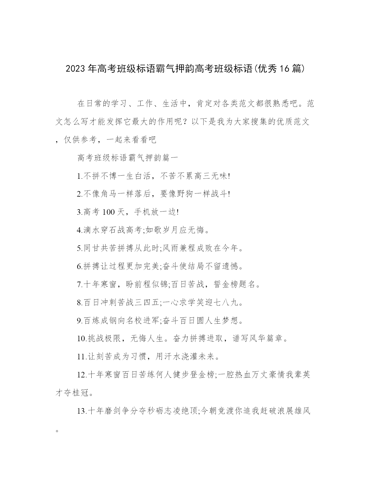 2023年高考班级标语霸气押韵高考班级标语(优秀16篇).docx