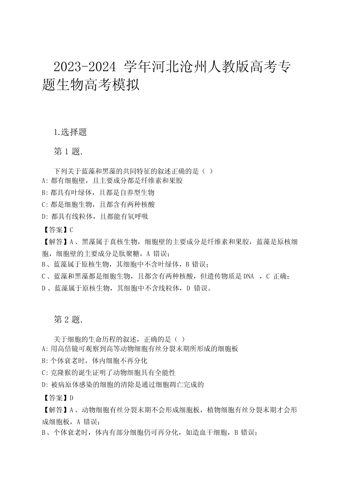 2023-2024学年河北沧州人教版高考专题生物高考模拟习题及解析.pdf