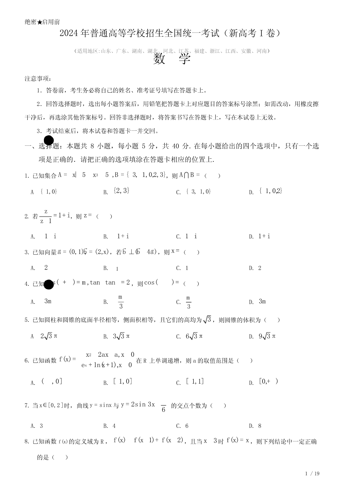 绝密★启用前2024年普通高等学校招生全国统一考试(新高考I卷)(适用地区:山东、广东、湖南、湖北、河北、江苏、福建、浙江、江西、安徽、河南)数学注意事项:1.答卷前,考生务必将自己的姓名、准考证号填写在答题卡上。2.回答选择题时,选出每小题答案后,用铅笔把答题卡上对应题目的答案标号涂黑;如需改动,用橡皮擦干净后,再选涂其他答案标号。回答非选择题时,将答案书写在答题卡上,写在本试卷上无效。3.考试结束后,将本试卷和答题卡一并交回。一、选择题:本题共.8小题,每小题5分,共40分.在每小题给出的四个选项中,