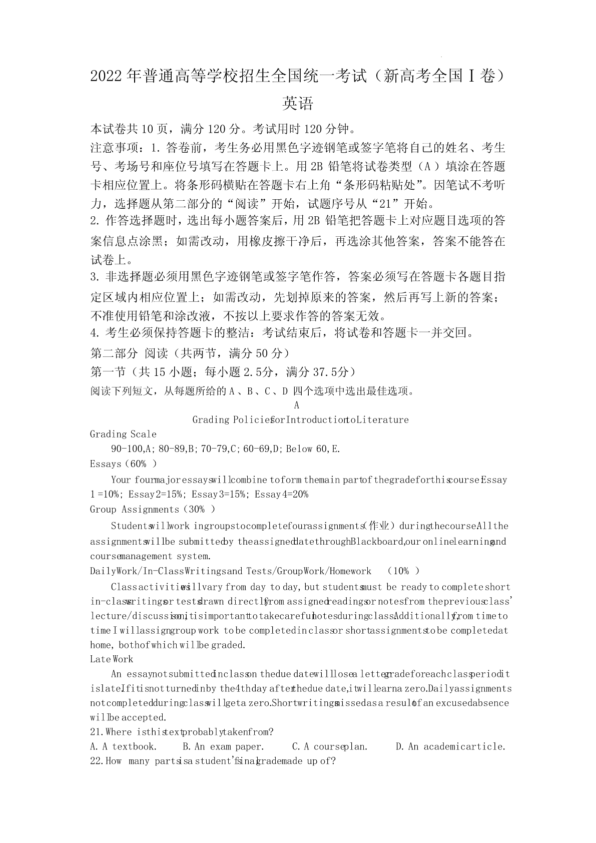 2022年普通高等学校招生全国统一考试(新高考全国Ⅰ卷)英语本试卷,满分120分。考试用时120分钟。注意事项:1.答卷前,考生务必用黑色字迹钢笔或签字笔将自己的姓名、考生号、考场号和座位号填写在答题卡上。用2B铅笔将试卷类型(A)填涂在答题卡相应位置上。将条形码横贴在答题卡右上角“条形码粘贴处”。因笔试不考听力,选择题从第二部分的“阅读”开始,试题序号从“21”开始。2.作答选择题时,选出每小题答案后,用2B铅笔把答题卡上对应题目选项的答案信息点涂黑;如需改动,用橡皮擦干净后,再选涂其他答案,答案不能答