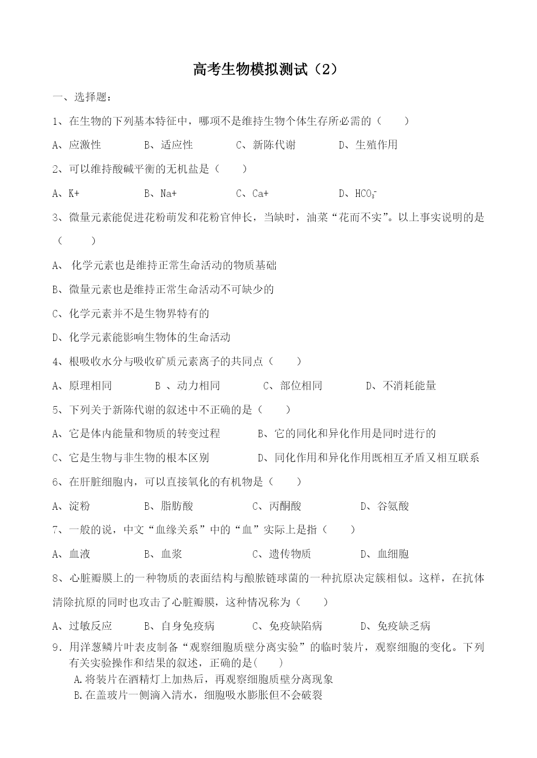 高考生物模拟测试(2)选择题:1、在生物的下列基本特征中,哪项不是维持生物个体生存所必需的()A、应激性B、适应性C、新陈代谢D、生殖作用2、可以维持酸碱平衡的无机盐是()A、K+B、Na+C、Ca+D、HCO3-3、微量元素能促进花粉萌发和花粉官伸长,当缺时,油菜“花而不实”。以上事实说明的是()化学元素也是维持正常生命活动的物质基础B、微量元素也是维持正常生命活动不可缺少的C、化学元素并不是生物界特有的D、化学元素能影响生物体的生命活动4、根吸收水分与吸收矿质元素离子的共同点()A、原理相同B、动力相