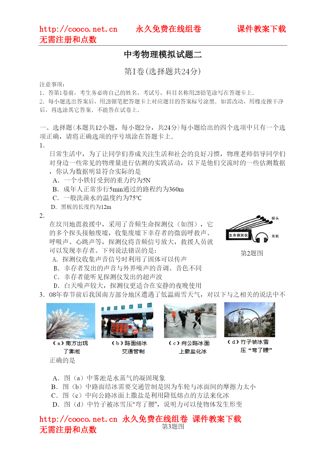 http://cooco.net.cn永久免费在线组卷课件教案下载无需注册和点数http://cooco.net.cn永久免费在线组卷课件教案下载无需注册和点数中考物理模拟试题二第=1\*ROMANI卷(选择题共24分)注意事项:1.答第1卷前,考生务必将自己的姓名、考试号、科目名称用2B铅笔涂写在答题卡上.2.每小题选出答案后,用2B锯笔把答题卡上对应题目的答案标号涂黑.如需改动,用橡皮擦干净后,再选涂其它答案.不能答在试卷上.一、选择题(本题共12小题,每小题2分,共24分)每小题给出的四个选项
