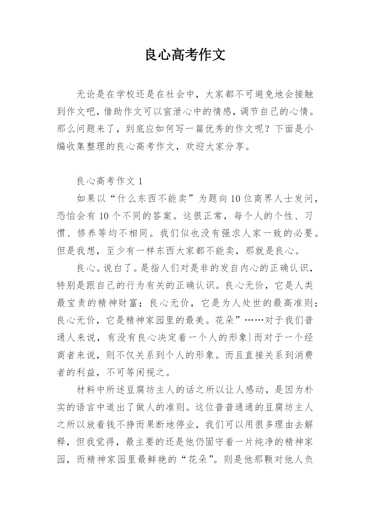 良心高考作文无论是在学校还是在社会中,大家都不可避免地会接触到作文吧,借助作文可以宣泄心中的情感,调节自己的心情。那么问题来了,到底应如何写一篇优秀的作文呢?下面是小编收集整理的良心高考作文,欢迎大家分享。良心高考作文1如果以“什么东西不能卖”为题向10位商界人士发问,恐怕会有10个不同的答案。这很正常,每个人的个性、习惯、修养等均不相同。我们似也没有强求人家一致的必要。但是我想,至少有一样东西大家都不能卖,那就是良心。良心。说白了。是指人们对是非的发自内心的正确认识,特别是跟自己的行为有关的正确认识。良
